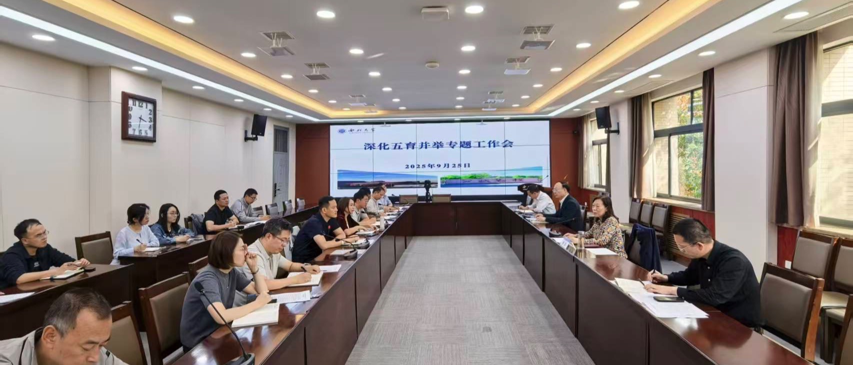 9月25日,学校在长安校区召开深化五育并举专题工作会。学工部、校团委、教务处等相关单位负责人及部分院系代表参加会议。会议由副校长曹蓉主持。体育部、公共艺术中心、教务处劳动教育工作负责人分别从体质健康水平、审美素养提升、劳动学分设置等方面汇报了学校体育、美育、劳育工作的协同推进情况,详细介绍了课程教学、活动开展、条件保障及评价机制等方面的具体举措与阶段性成效,系统梳理了学校在构建德智体美劳全面发展育...