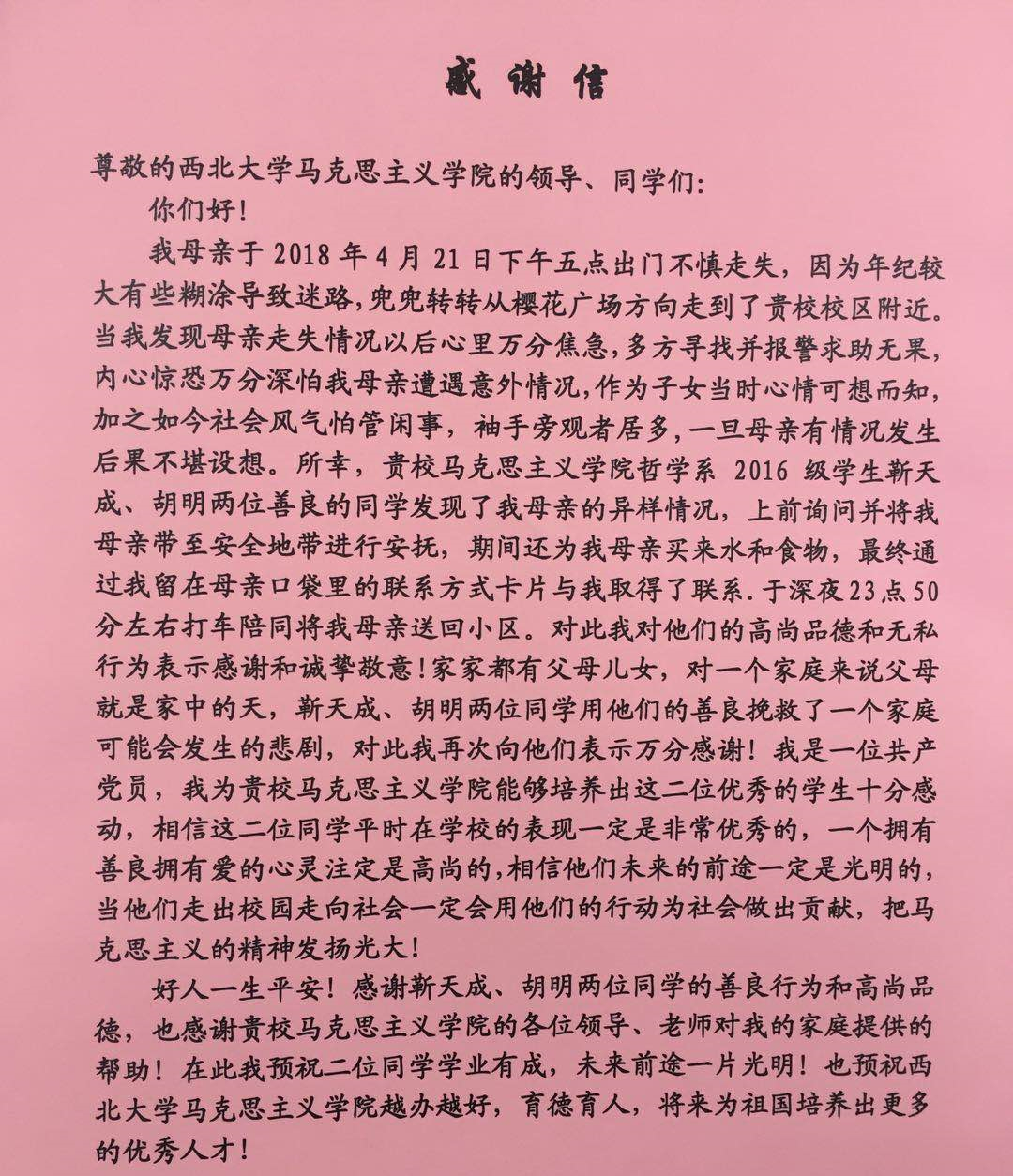 5月1日,家住长安区的张先生专程为伟德马克思主义学院送来感谢信,对2016级哲学专业本科生靳天成、胡明两位同学护送其母亲回家的善举表示感谢。张先生向伟德工作人员介绍到,他的母亲年事已高,记忆力下降,于4月21日...
