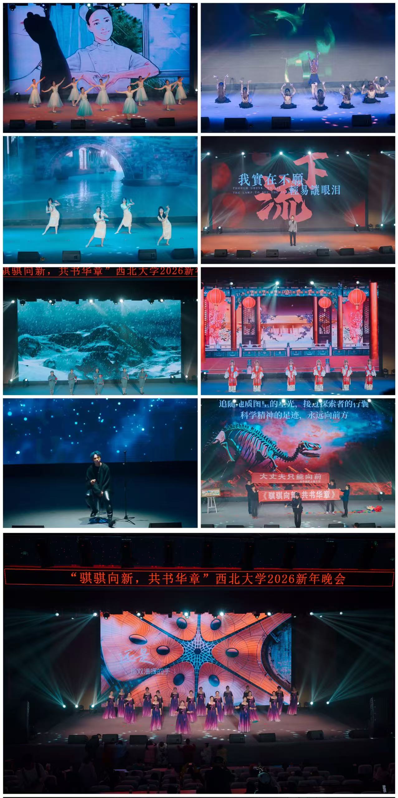 晚会在教职工艺术团与学生艺术团联袂献上的开场舞中启幕,“DIAMONDS”的动感活力与《盛世牡丹》的恢弘大气交相辉映,璀璨的舞姿和夺目的舞台效果,点燃全场热情。整场晚会节目形式多样、内容丰富多彩,高潮迭起。女声独唱《珊瑚颂》悠扬婉转,相声《他就这么个人》以诙谐幽默的方式讲述了辅导员心系学生、倾情奉献的日常点滴,引得台下笑声不断。舞蹈《一条大河》表达对家乡和祖国的深切热爱。附属幼儿园的26位小朋友们身着民族服饰、踏着稚嫩而自信的步伐带来走秀节目《丝路童梦》,展现了丝绸之路上的文化交融之美。器乐合奏《丹雀静影》巧妙融合传统民乐与现代编曲,意境幽远。歌曲《公路之歌》节奏铿锵,激励人直面挑战、勇敢追梦。第一医院带来的舞蹈《如愿》别具匠心,将急诊室紧张的抢救场景艺术化地融入舞蹈,诠释了医护人员守护生命的赤诚与担当。拉丁舞“LOVE”热情奔放,古典舞《外婆桥》温婉灵动,男声独唱《流浪记》深情动人,京剧《娄山关》气势磅礴,秦腔《五典坡·飘彩》韵味醇厚,流行歌曲联唱则燃动全场。压轴节目魔术《恐龙史话》由伟德老校长、中国古脊椎动物学的开拓者和奠基人杨钟健先生的曾孙女与侄女联袂表演,通过深情的演讲和奇幻的魔术手法,生动再现了杨钟健先生的科学探索精神与杰出成就,创意十足、妙趣横生,将晚会推向高潮。