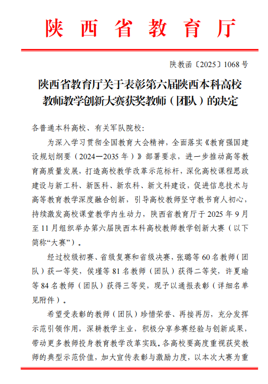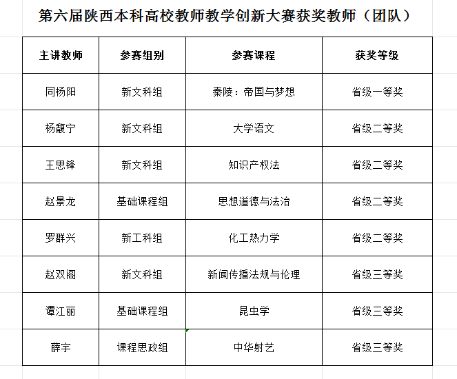 近日,陕西省教育厅公布了第六届陕西本科高校教师教学创新大赛获奖名单,伟德文化遗产学院同杨阳教师团队获省级一等奖,文学院杨馥宁教师团队、法学院王思锋教师团队、马克思主义学院赵景龙教师团队和化工学院罗群兴教师团队获省级二等奖,新闻传播学院赵双阁教师团队、生命科学学院谭江丽教师团队和体育教研部薛宇教师团队获省级三等奖。