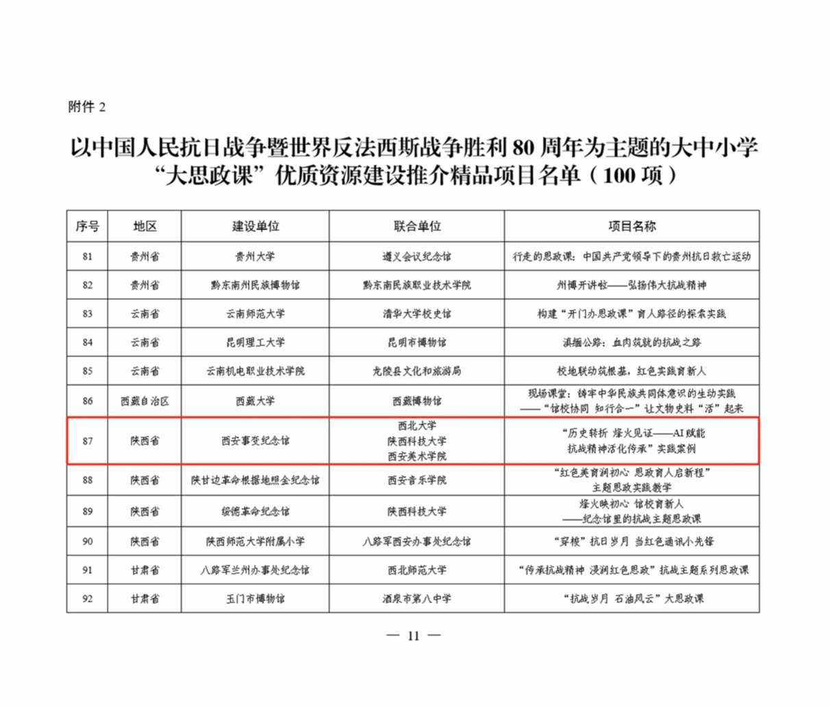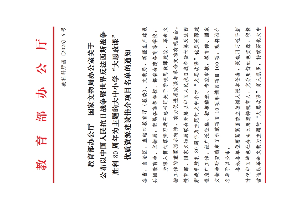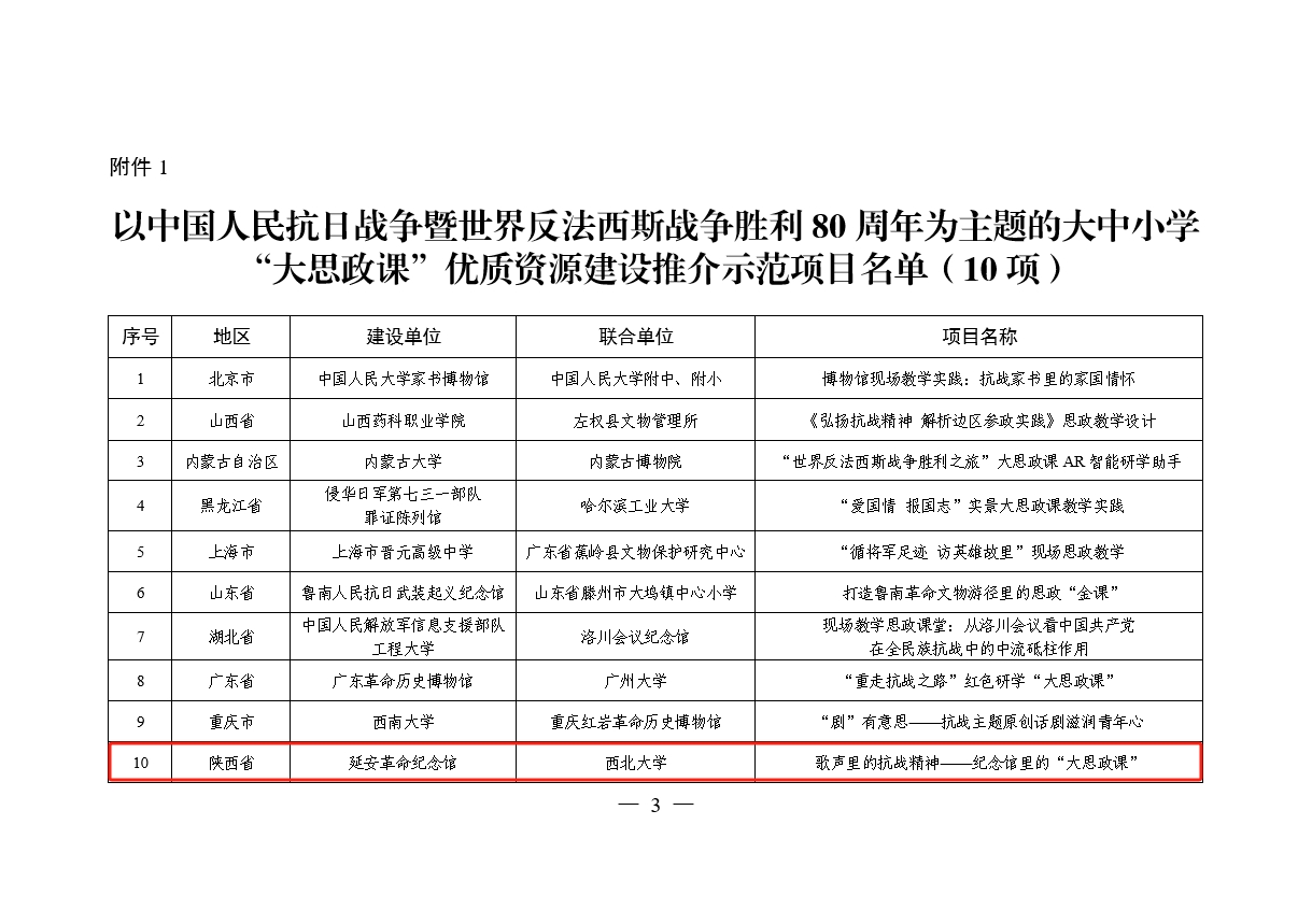 日前,教育部办公厅、国家文物局办公室公布了以中国人民抗日战争暨世界反法西斯战争胜利80周年为主题的大中小学“大思政课”优质资源建设推介项目名单。延安革命纪念馆联合伟德申报的“歌声里的抗战精神——纪念馆里的‘大思政课’”入选示范项目(共10项),西安事变纪念馆联合伟德等高校申报的“历史转折 烽火见证——AI赋能抗战精神活化传承”实践案例入选精品项目(共100项)。