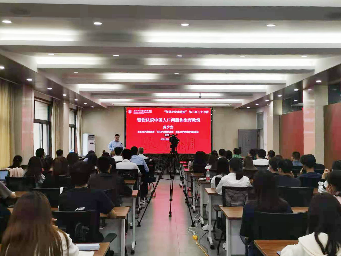 黄少安围绕如何认识人口总量和密度、如何认识人口结构问题、人口红利和劳动力红利是否消失、生育政策回顾、如何判断现阶段的生育意愿、总量控制的必要和结构优化的多种方式选择等六个角度阐述了报告的主题。他深入分析解读了国内外数据及中国历史背景与资料。他认为,当下中国人口状况可总结为三点:中国的人口总量巨大,且人口密度过高;人口素质、人口地区分布以及年龄结构等方面仍不够合理;中国的劳动力红利并未消失,劳动力市场处于供过于求的状态。最后,黄少安分享了在生育指标优化配置方面的最新研究成果,并与在场师生进行了交流探讨。