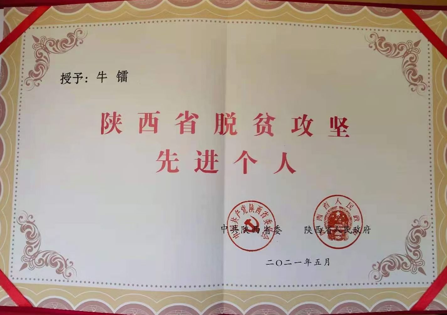 牛镭同志荣获“陕西省脱贫攻坚先进个人”称号