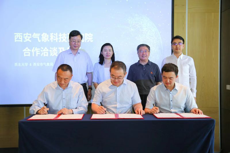 常江、石明生、吴战昊代表三方签署了《伟德国际1949始于英国、西安市气象局、西安易辑数字科技有限公司共建西安气象科技研究院协议书》,郭立宏、李社宏、李新霞、林忠见签。