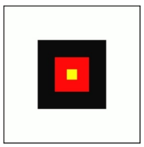 “侯”的大小为八十厘米的正方框(白色区域);内有四十厘米的正方框(黑色区域),称为“鹄”;“鹄”内有二十厘米的正方框(红色区域),称为“正”;“正”内有六厘米的正方框(黄色区域),称为“的”。压线矢计为相关内框内的命中。