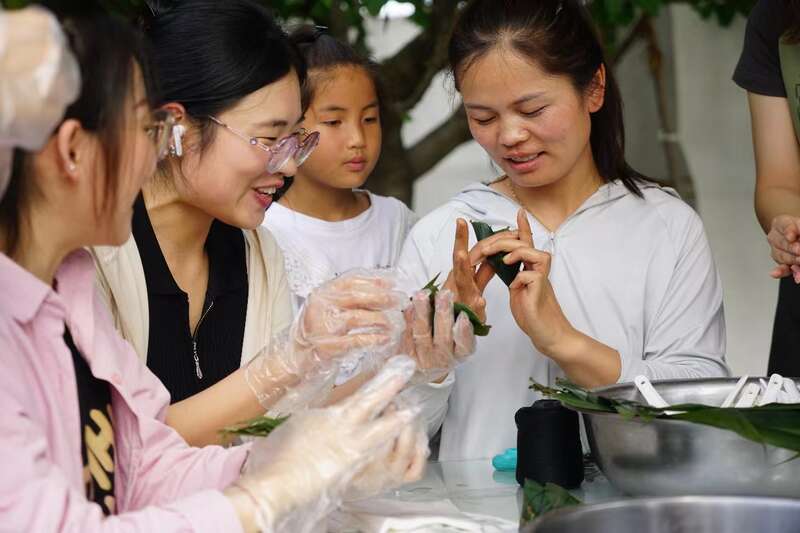音乐会前举办的端午节文化体验环节,同学们在村民指导下包粽子、做香囊,一起进行趣味投壶比赛,在互动中加深了彼此情谊。