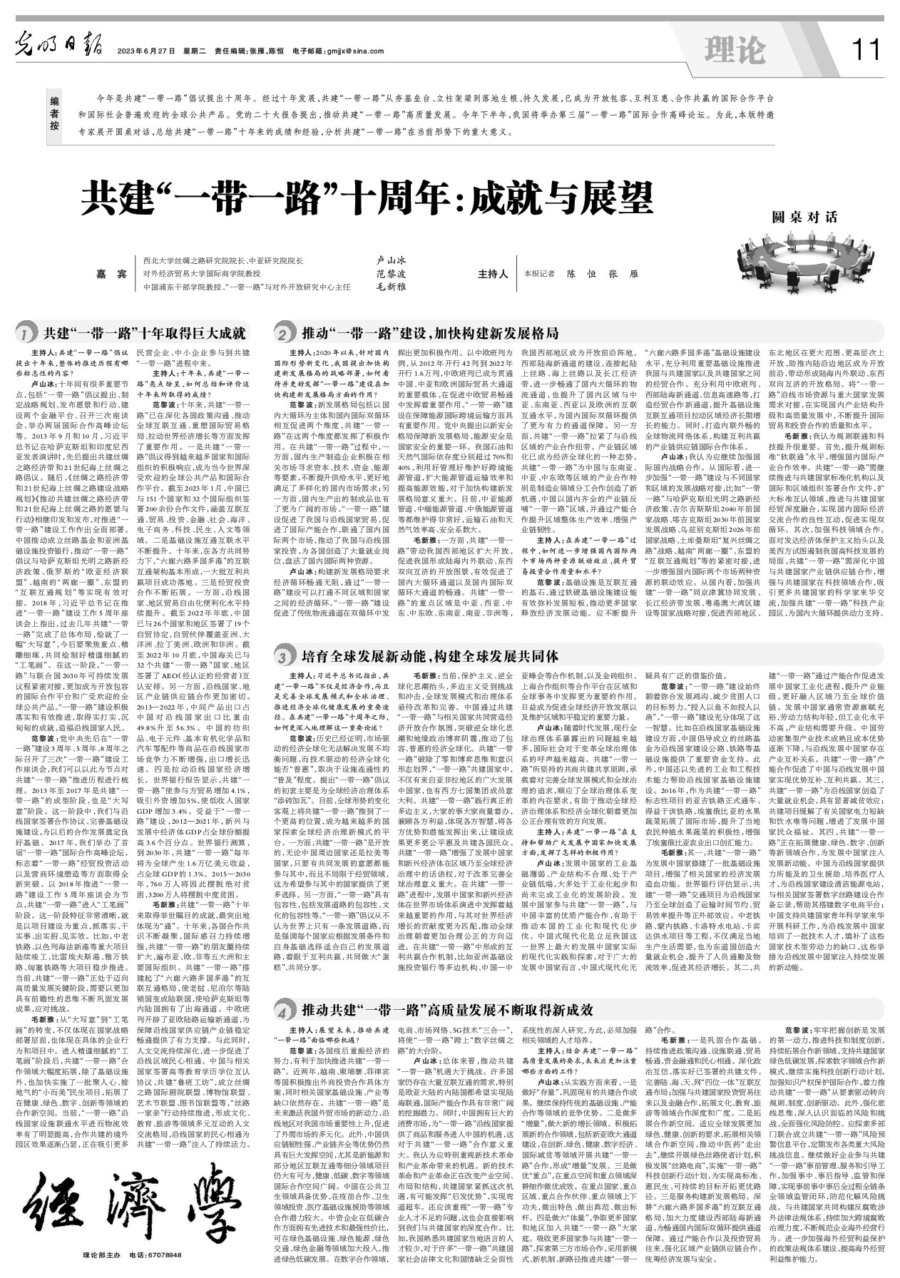 今年是共建“一带一路”倡议提出十周年。经过十年发展,共建“一带一路”从夯基垒台、立柱架梁到落地生根、持久发展,已成为开放包容、互利互惠、合作共赢的国际合作平台和国际社会普遍欢迎的全球公共产品。党的二十大报告提出,推动共建“一带一路”高质量发展。今年下半年,我国将举办第三届“一带一路”国际合作高峰论坛。为此,本版特邀专家展开圆桌对话,总结共建“一带一路”十年来的成绩和经验,分析共建“一带一路”在当前形势下的重大意义。