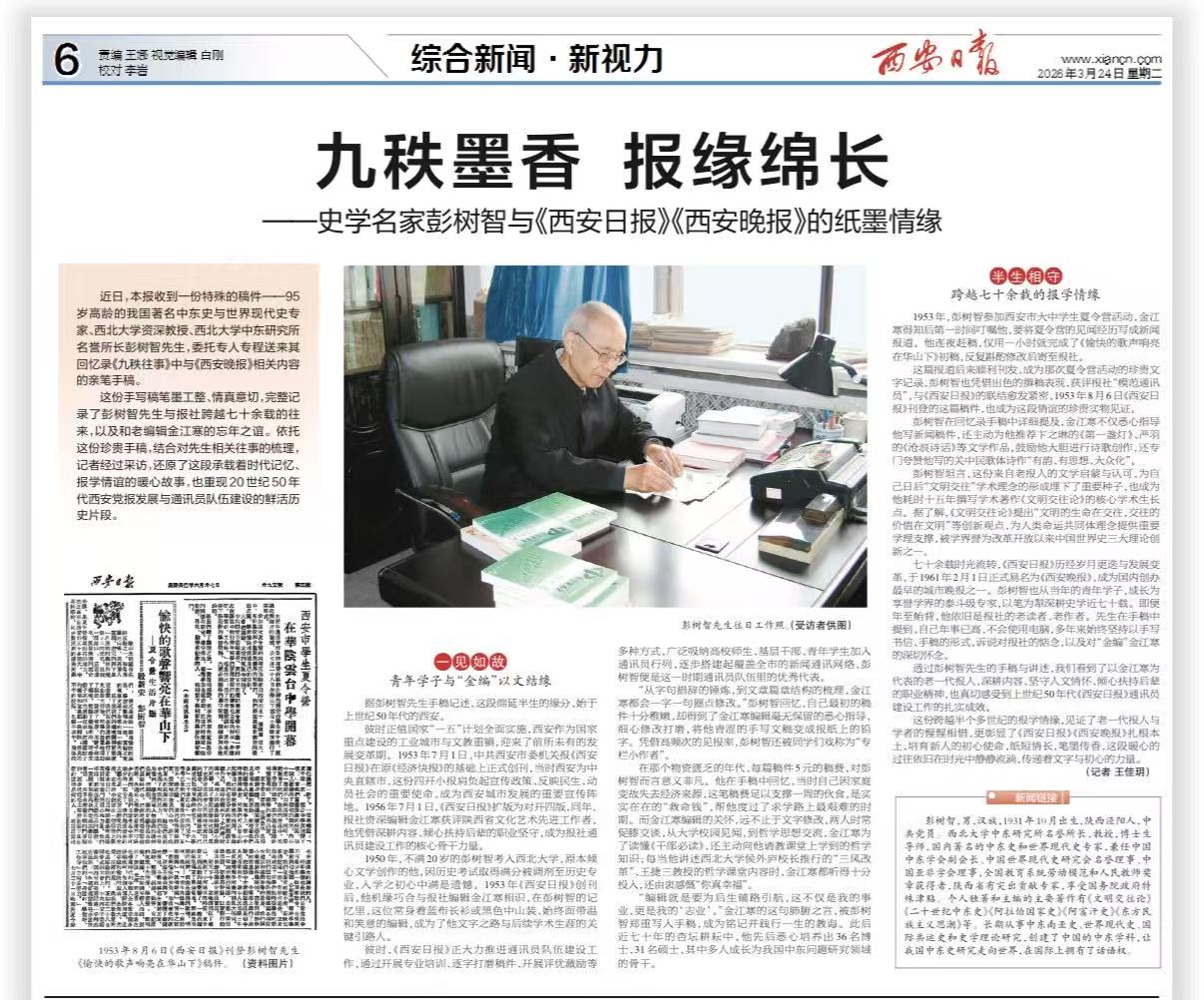 彭树智坦言,这份来自老报人的文学启蒙与认可,为自己日后“文明交往”学术理念的形成埋下了重要种子,也成为他耗时十五年撰写学术著作《文明交往论》的核心学术生长点。据了解,《文明交往论》提出“文明的生命在交往,交往的价值在文明”等创新观点,为人类命运共同体理念提供重要学理支撑,被学界誉为改革开放以来中国世界史三大理论创新之一。