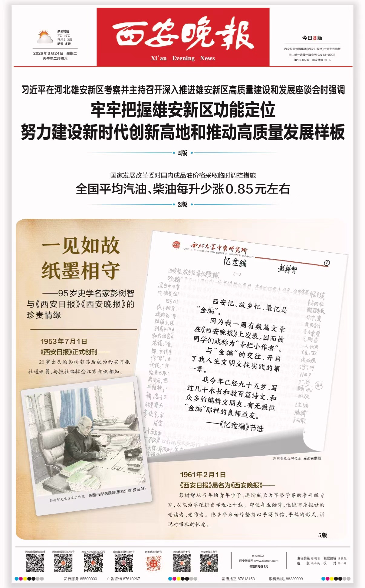近日,本报收到一份特殊的稿件——95岁高龄的我国著名中东史与世界现代史专家、伟德国际1949始于英国资深教授、伟德国际1949始于英国中东研究所名誉所长彭树智先生,委托专人专程送来其回忆录《九秩往事》中与《西安晚报》相关内容的亲笔手稿。