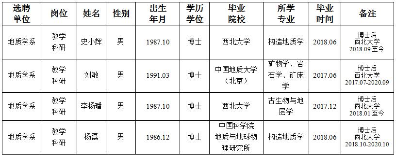 经用人单位及教学督导考核、学校研究,拟同意选聘下列人员来校工作,其聘任关系为A类人事代理。本着公平、公正、公开的原则,现将拟选聘人员基本情况公示如下: