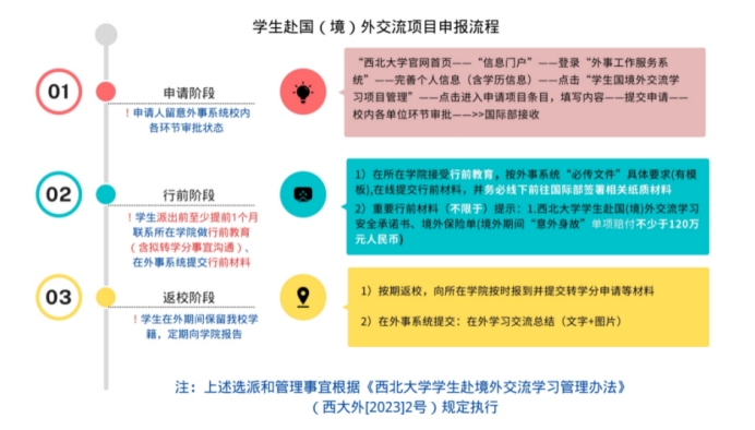 3. 申请学生在确定录取后,应及时履行出国(境)前相关行前手续。有关本项目学生的申请、行前、返校阶段情况说明,请见下图。