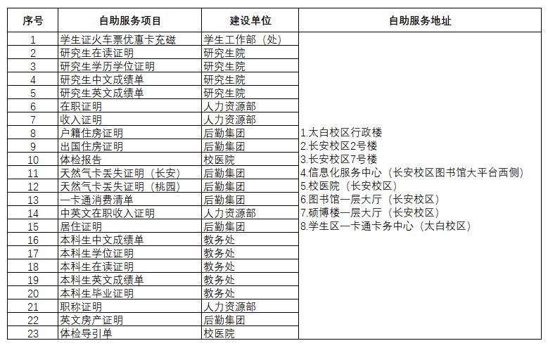 长安校区:卡务中心收费室、信息化服务中心(图书馆对面大平台西侧)、学生食堂(紫金苑、玉兰苑)