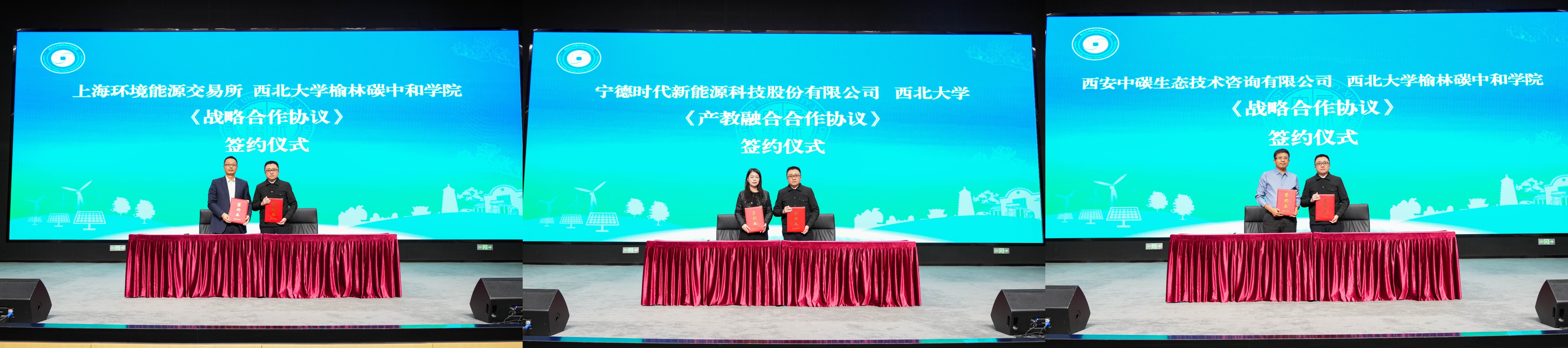 校企合作、产教融合,是培养高素质“双碳”人才的必由之路,也是学校服务国家战略、赋能产业发展的重要举措。活动上,学院负责人陈京京分别与上海环境能源交易所、宁德时代新能源科技股份有限公司、西安中碳生态技术咨询有限公司签署校企合作协议。