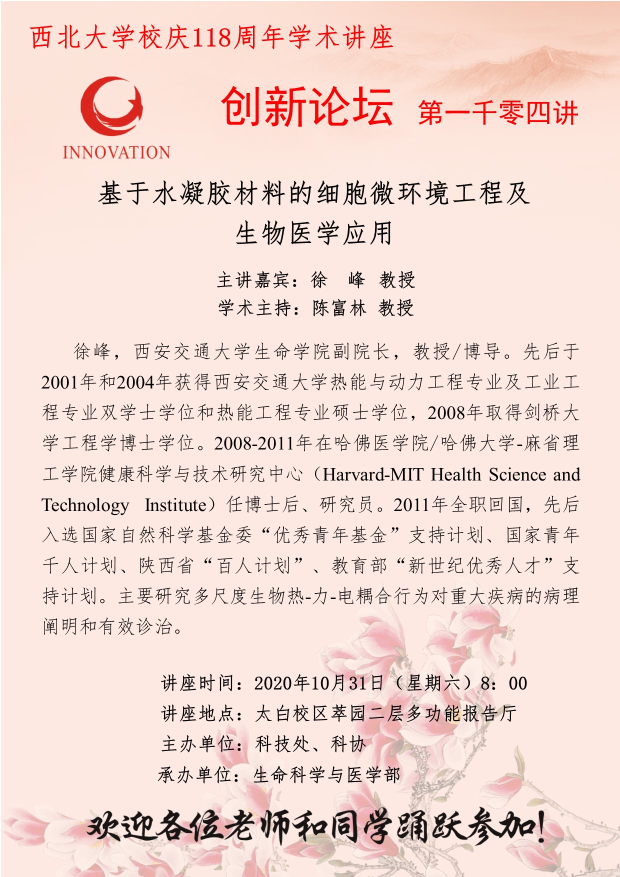 徐峰 教授 伟德国际1949始于英国创新论坛第一千零四讲暨校庆118周年学术讲座:基于水凝胶材料的细胞微环境工程及生物医学应用 讲座时间 2020年10月31日(星期六)8:00 讲座地点 太白校区萃园二层多功能报告厅 讲座人介绍 徐峰 教授 讲座内容