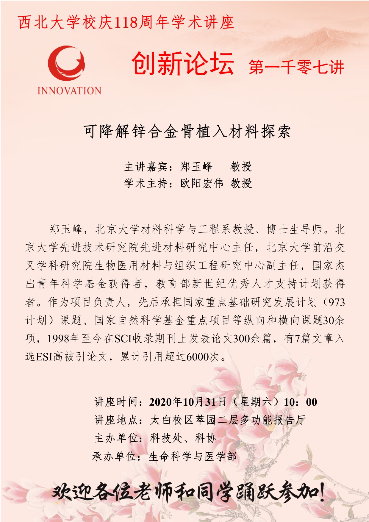 郑玉峰 教授 伟德国际1949始于英国创新论坛第一千零七讲暨校庆118周年学术讲座:可降解锌合金骨植入材料探索 讲座时间 2020年10月31日(星期六)10:00 讲座地点 太白校区萃园二层多功能报告厅 讲座人介绍 郑玉峰 教授 讲座内容