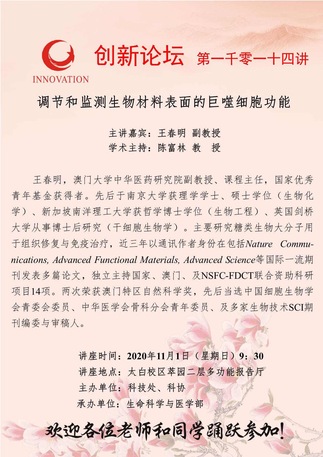 王春明 副教授 伟德国际1949始于英国创新论坛第一千零一十四讲:调节和监测生物材料表面的巨噬细胞功能 讲座时间 2020年11月1日(星期日)9:30 讲座地点 太白校区萃园二层多功能报告厅 讲座人介绍 王春明 副教授 讲座内容