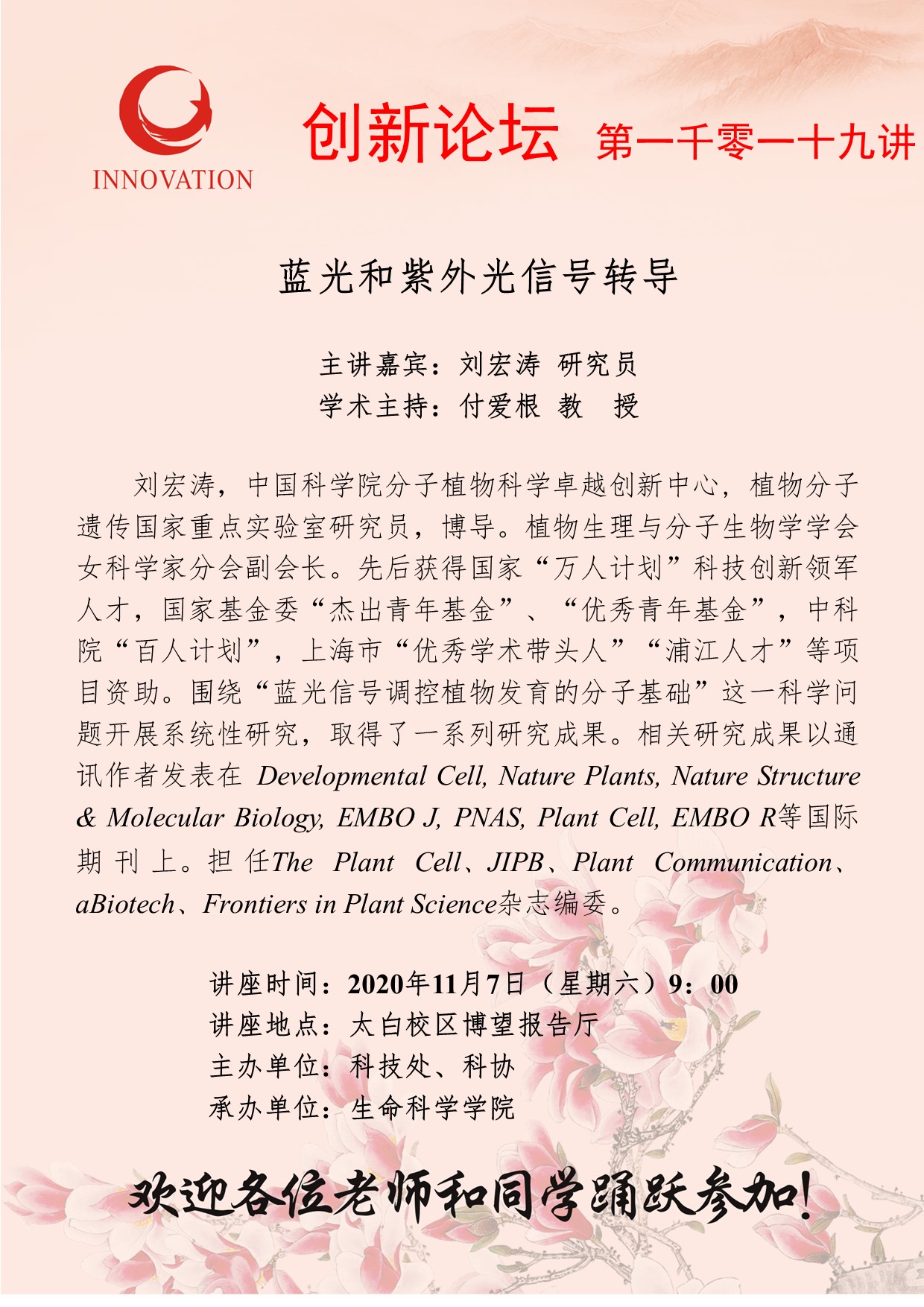 刘宏涛 研究员 伟德国际1949始于英国创新论坛第一千零一十九讲:蓝光和紫外光信号转导 讲座时间 2020年11月7日(星期六)9:00 讲座地点 太白校区博望报告厅 讲座人介绍 刘宏涛 研究员 讲座内容