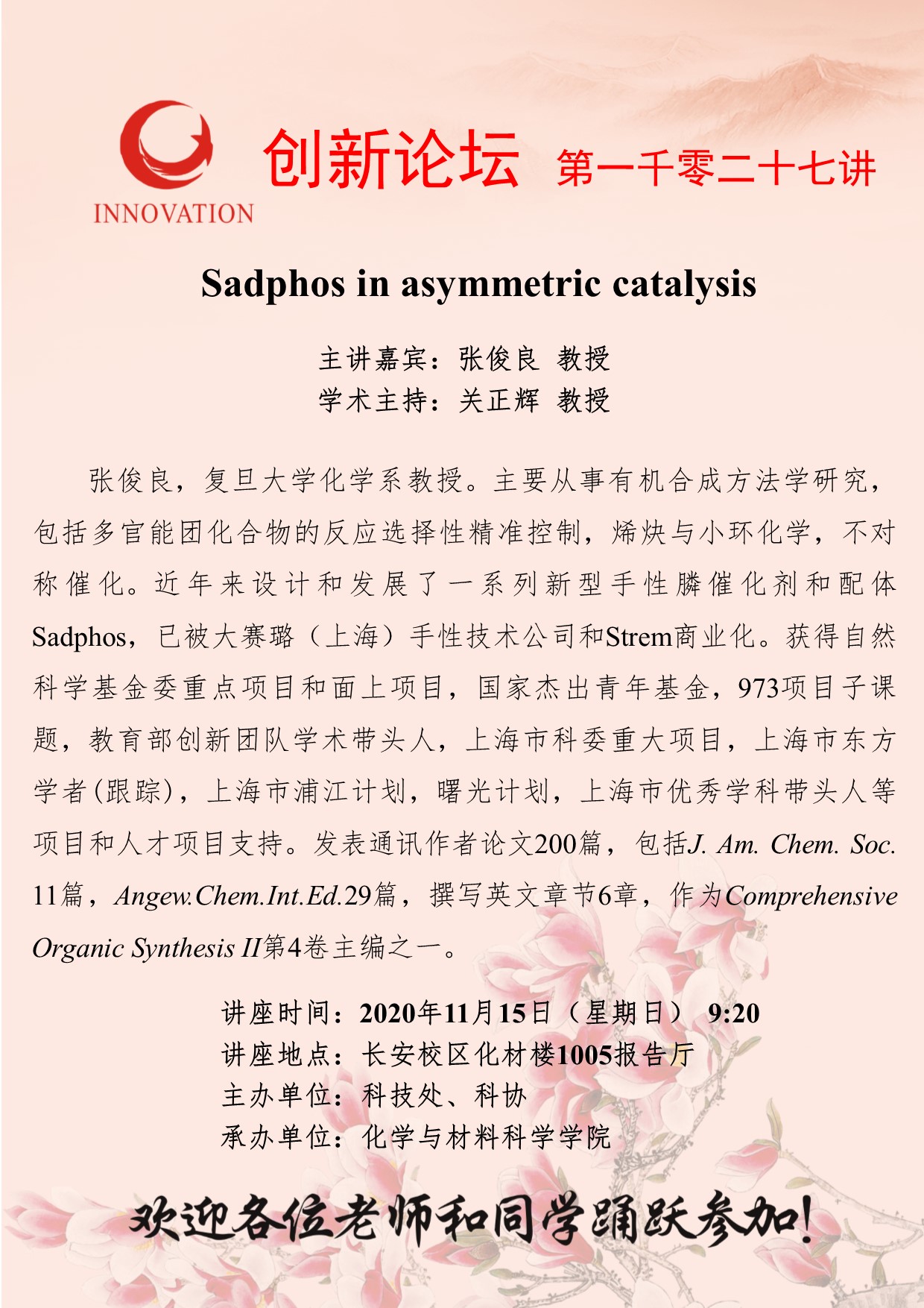 张俊良 教授 伟德国际1949始于英国创新论坛第一千零二十七讲:Sadphos in asymmetric catalysis 讲座时间 2020年11月15日(星期日)9:20 讲座地点 长安校区化材楼1005报告厅 讲座人介绍 张俊良 教授 讲座内容