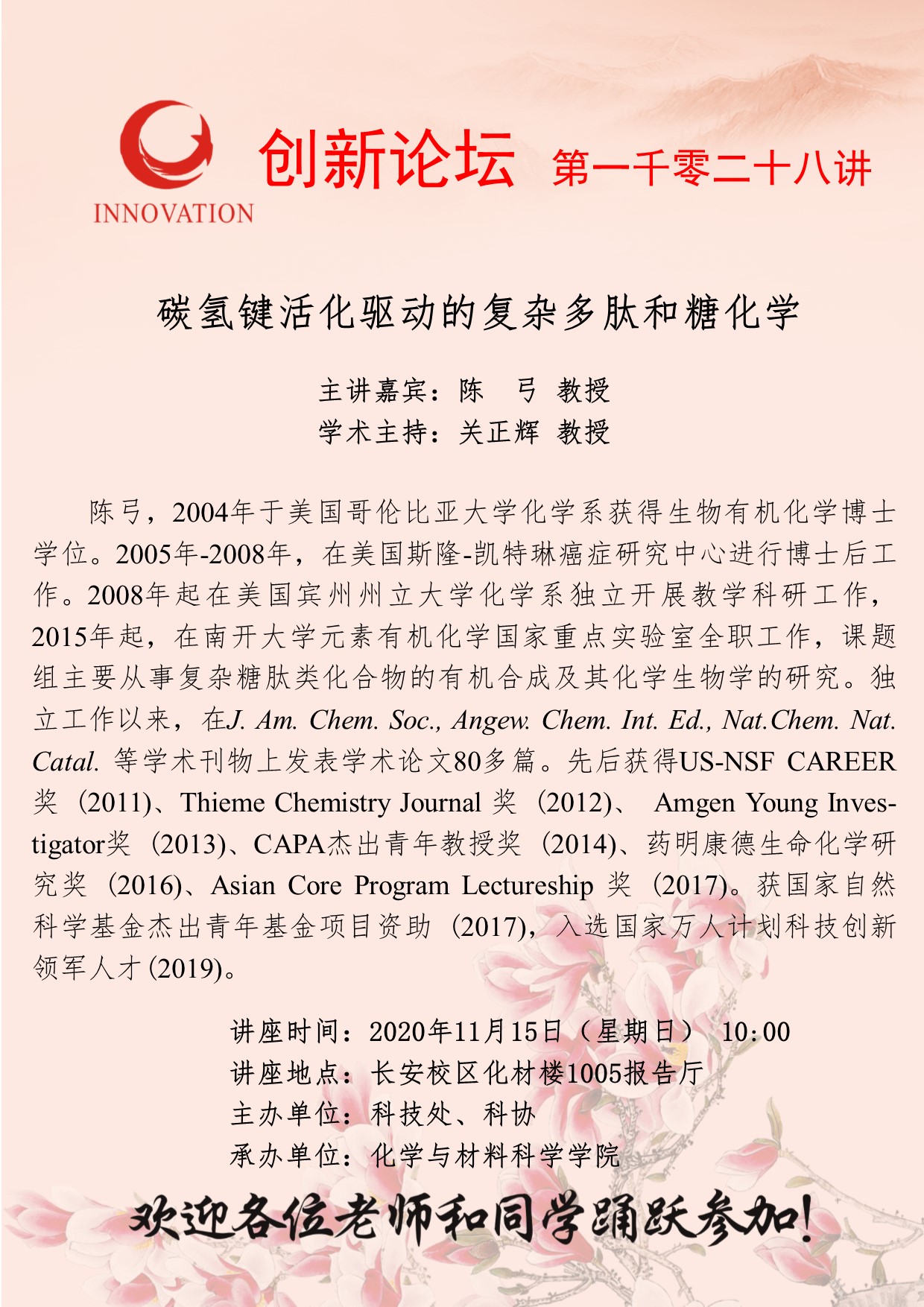 陈 弓 教授 伟德国际1949始于英国创新论坛第一千零二十八讲:碳氢键活化驱动的复杂多肽和糖化学 讲座时间 2020年 11月15日(星期日)10:00 讲座地点 长安校区化材楼1005报告厅 讲座人介绍 陈 弓 教授 讲座内容
