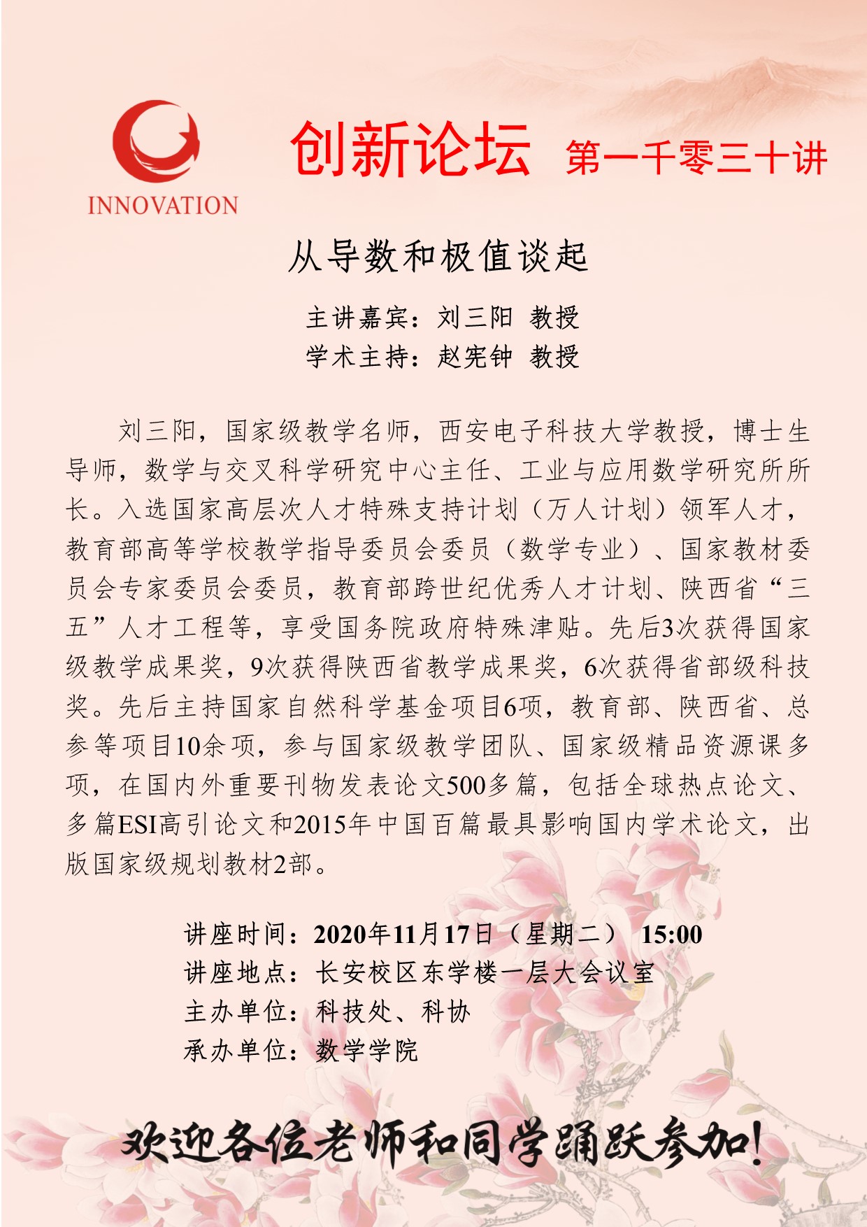 刘三阳 教授 伟德国际1949始于英国创新论坛第一千零三十讲:从导数和极值谈起 讲座时间 2020年11月17日(星期二) 15:00 讲座地点 长安校区东学楼一层大会议室 讲座人介绍 刘三阳 教授 讲座内容