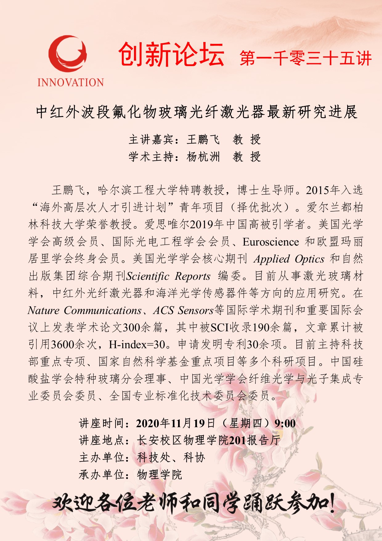 王鹏飞 教授 伟德国际1949始于英国创新论坛第一千零三十五讲:中红外波段氟化物玻璃光纤激光器最新研究进展 讲座时间 2020年11月19日(星期四) 9:00 讲座地点 长安校区物理学院201报告厅 讲座人介绍 王鹏飞 教授 讲座内容