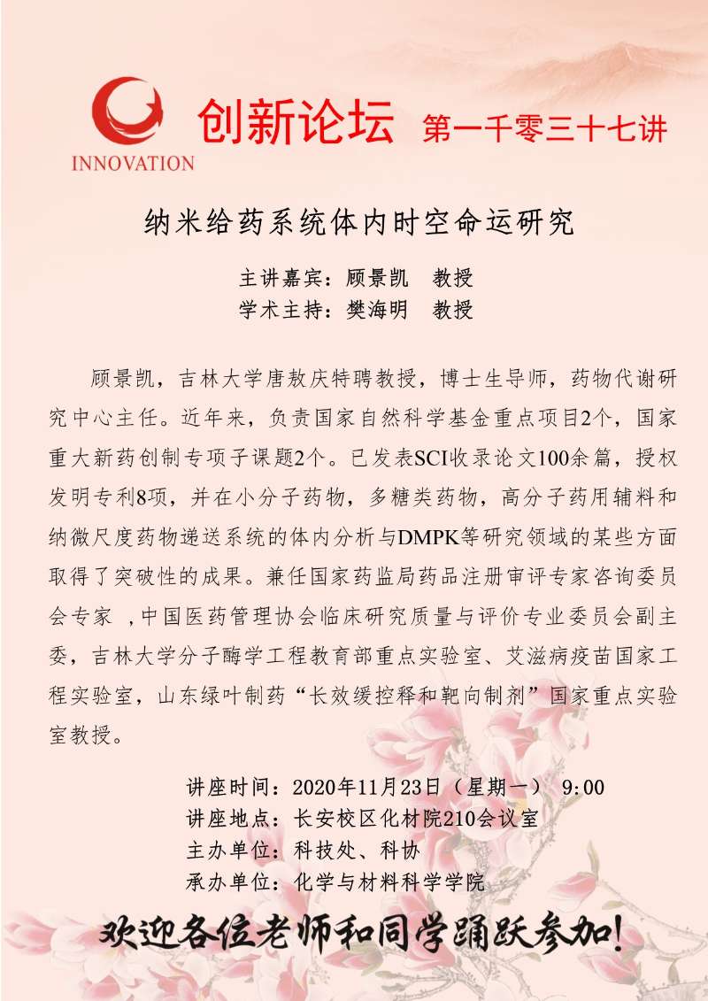 顾景凯 教授 伟德国际1949始于英国创新论坛第一千零三十七讲:纳米给药系统体内时空命运研究 讲座时间 2020年11月23日(星期一) 9:00 讲座地点 长安校区化材院210会议室 讲座人介绍 顾景凯 教授 讲座内容