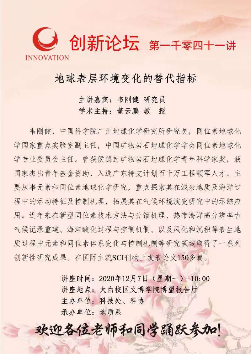 韦刚健 研究员 伟德国际1949始于英国创新论坛第一千零四十一讲:地球表层环境变化的替代指标 讲座时间 2020年12月7日(星期一) 10:00 讲座地点 太白校区文博学院博望报告厅 讲座人介绍 韦刚健 研究员 讲座内容