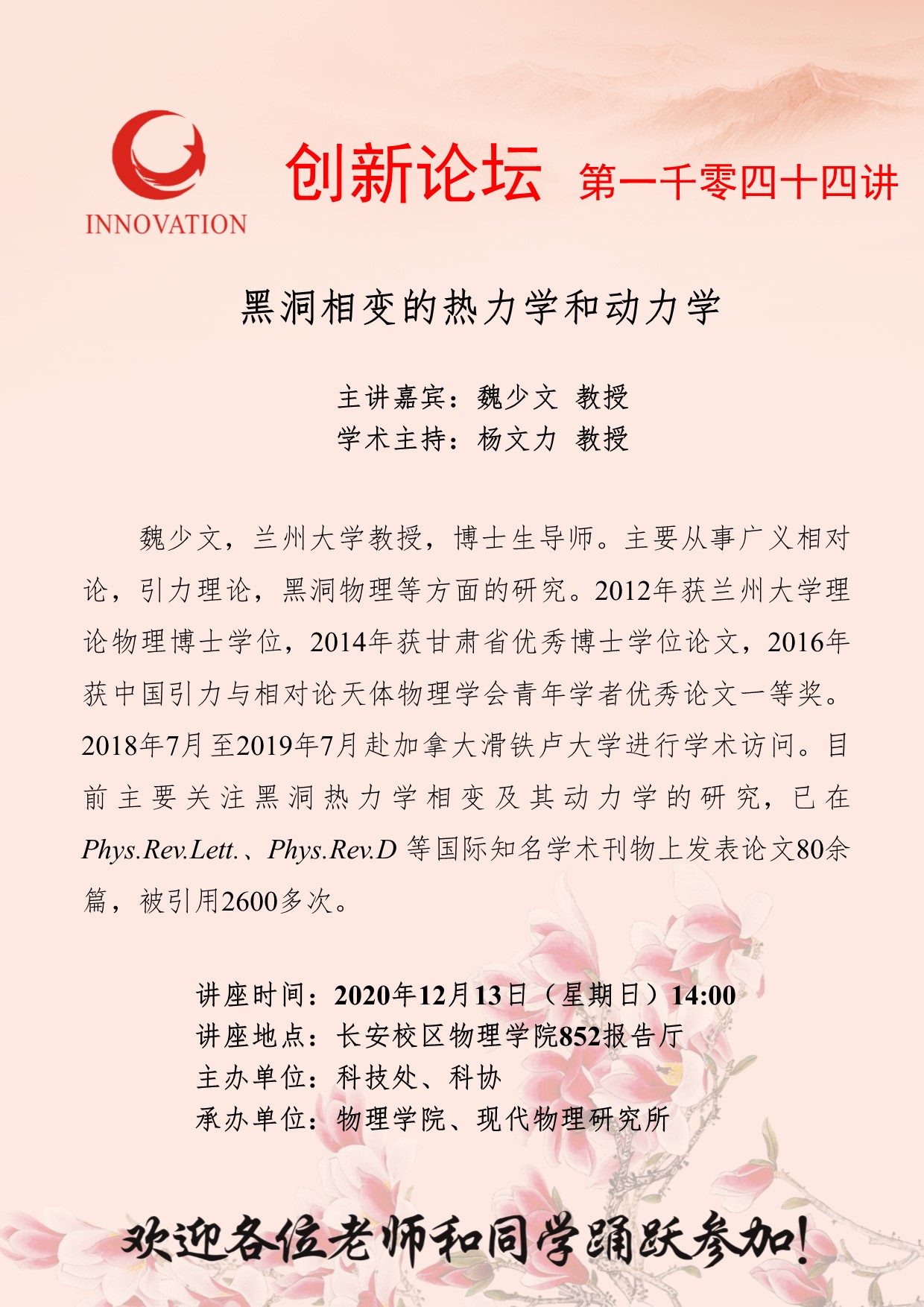 魏少文 教授 伟德国际1949始于英国创新论坛第一千零四十四讲:黑洞相变的热力学和动力学 讲座时间 2020年12月13日(星期日)14:00 讲座地点 长安校区物理学院852报告厅 讲座人介绍 魏少文 教授 讲座内容