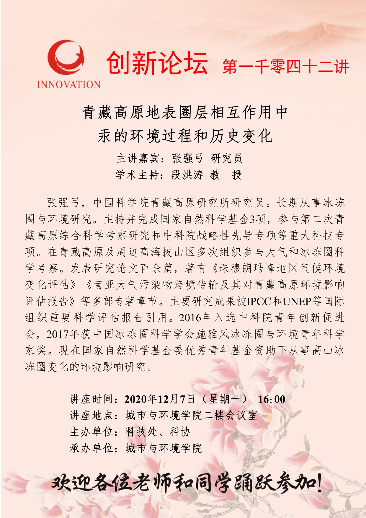张强弓 研究员 伟德国际1949始于英国创新论坛第一千零四十二讲:青藏高原地表圈层相互作用中汞的环境过程和历史变化 讲座时间 2020年12月7日(星期一) 16:00 讲座地点 城市与环境学院二楼会议室 讲座人介绍 张强弓 研究员 讲座内容
