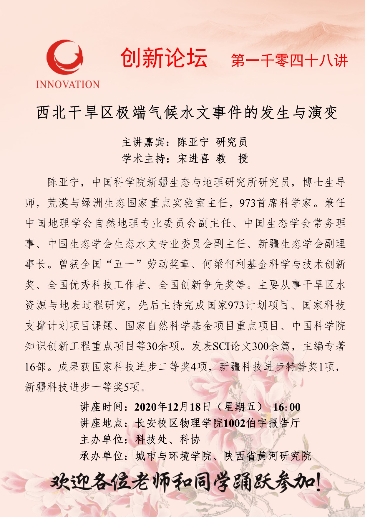 陈亚宁 研究员 伟德国际1949始于英国创新论坛第一千零四十八讲:西北干旱区极端气候水文事件的发生与演变研究 讲座时间 2020年12月18日(星期五)16:00 讲座地点 长安校区物理楼伯宇报告厅 讲座人介绍 陈亚宁 研究员 讲座内容