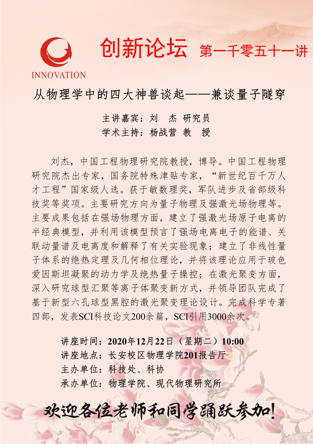刘 杰 研究员 伟德国际1949始于英国创新论坛第一千零五十一讲:从物理学中的四大神兽谈起——兼谈量子隧穿 讲座时间 2020年12月22日(星期二)10:00 讲座地点 长安校区物理学院201报告厅 讲座人介绍 刘 杰 研究员 讲座内容