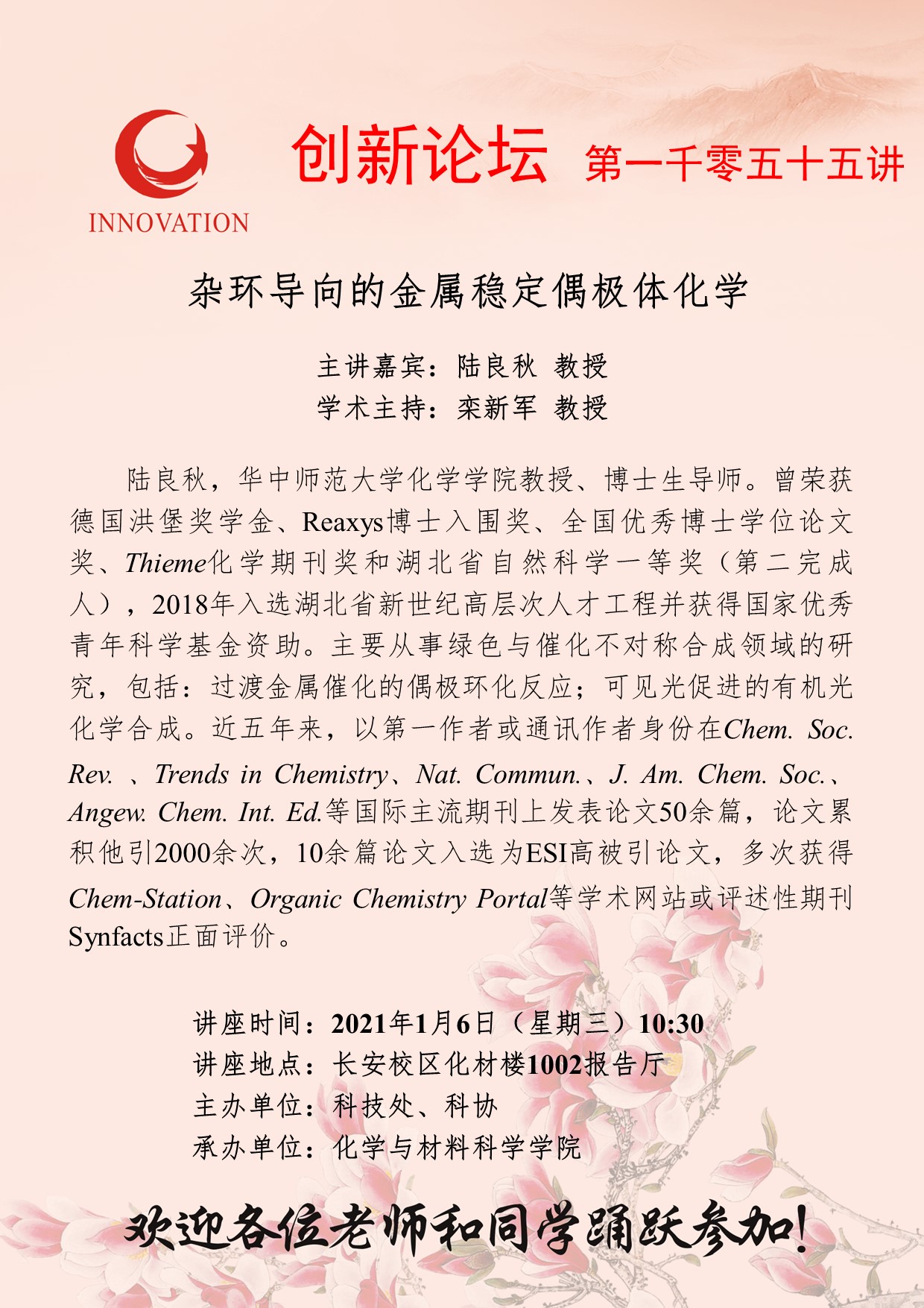 陆良秋 教授 伟德国际1949始于英国创新论坛第一千零五十五讲:杂环导向的金属稳定偶极体化学 讲座时间 2021年1月6日(星期三)10:30 讲座地点 长安校区化材楼1002报告厅 讲座人介绍 陆良秋 教授 讲座内容