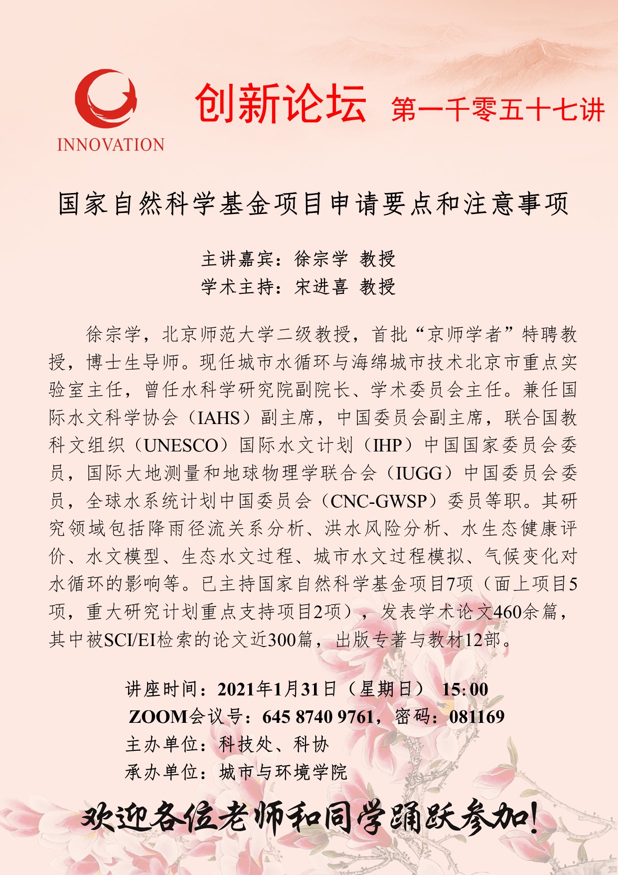 徐宗学 教授 伟德国际1949始于英国创新论坛第一千零五十七讲:国家自然科学基金项目申请要点和注意事项 讲座时间 2021年1月31日(星期日) 15:00 讲座地点 ZOOM会议号:64587409761,密码:081169 讲座人介绍 徐宗学 教授 讲座内容