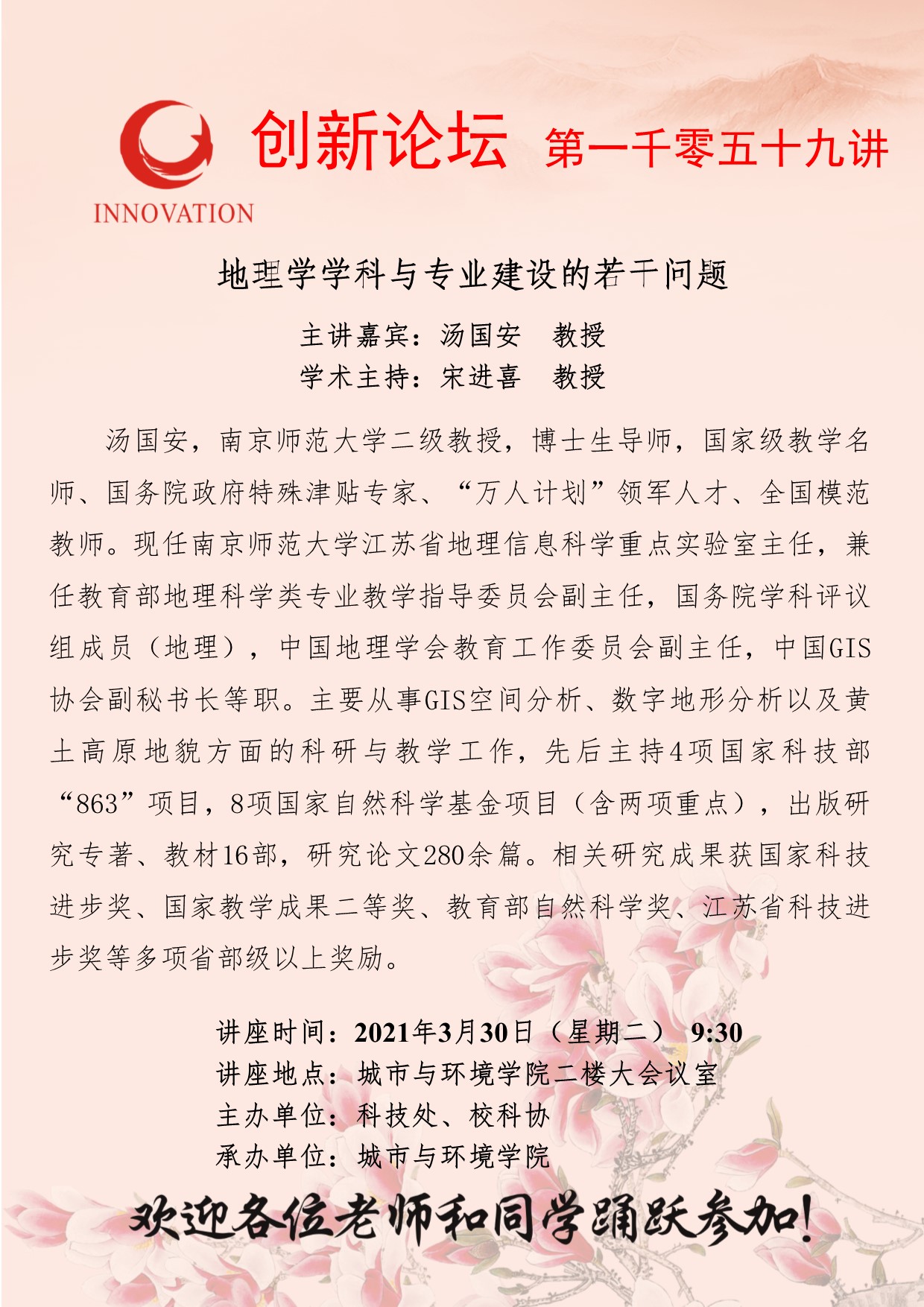 汤国安 教授 伟德国际1949始于英国创新论坛第一千零五十九讲:地理学学科与专业建设的若干问题 讲座时间 2021年3月30日(星期二) 9:30 讲座地点 城市与环境学院二楼大会议室 讲座人介绍 汤国安 教授 讲座内容