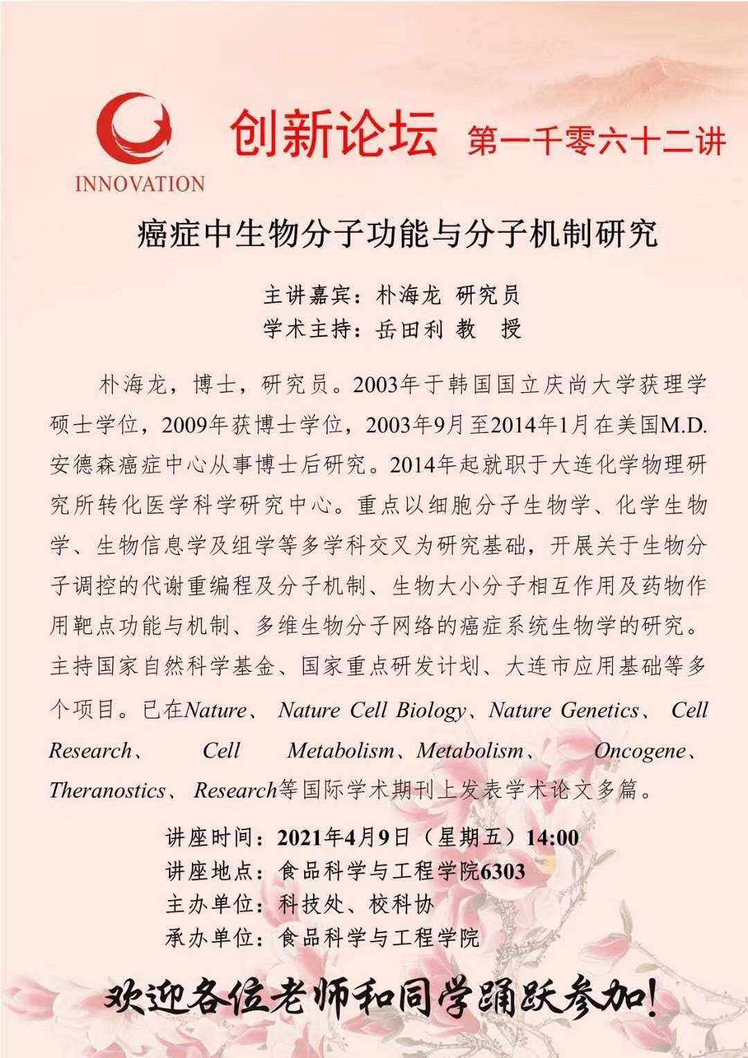 朴海龙 研究员 伟德国际1949始于英国创新论坛第一千零六十二讲:癌症中生物分子功能与分子机制研究 讲座时间 2021年4月9日(星期五)14:00 讲座地点 食品科学与工程学院6303 讲座人介绍 朴海龙 研究员 讲座内容