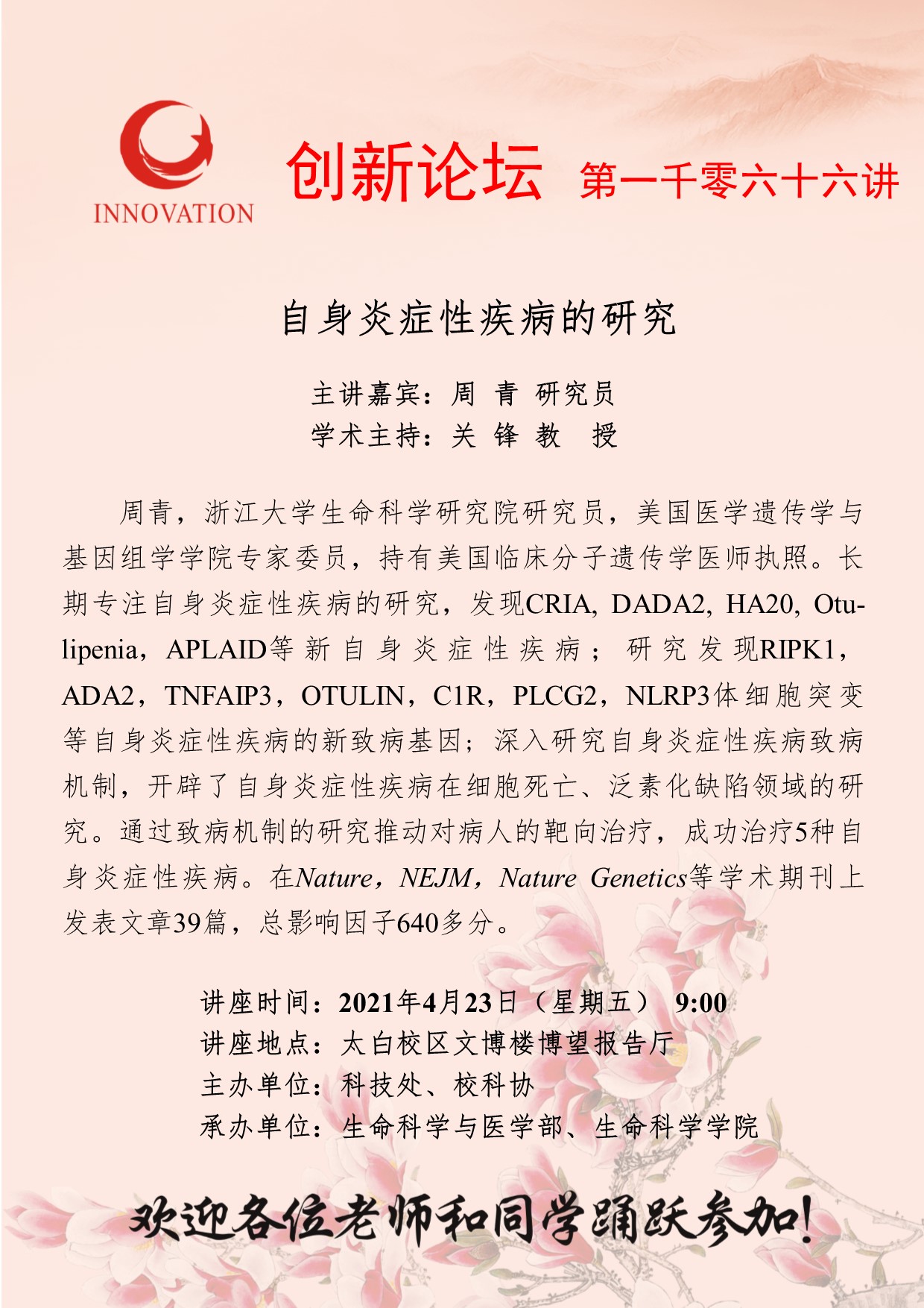 周 青 研究员 伟德国际1949始于英国创新论坛第一千零六十六讲:自身炎症性疾病的研究 讲座时间 2021年4月23日(星期五) 9:00 讲座地点 太白校区文博楼博望报告厅 讲座人介绍 周 青 研究员 讲座内容