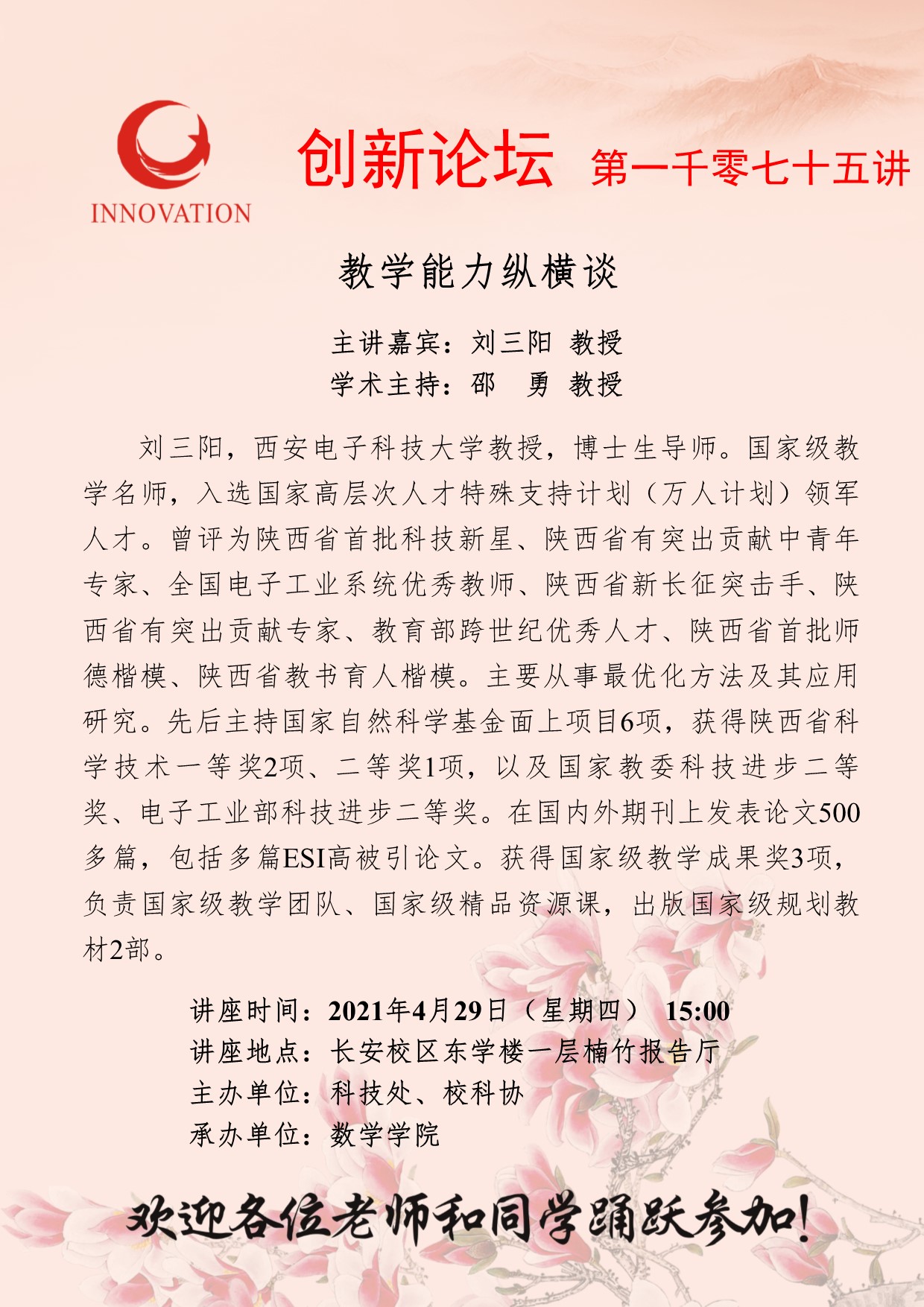 刘三阳 教授 伟德国际1949始于英国创新论坛第一千零七十五讲:教学能力纵横谈 讲座时间 2021年4月29日(星期四) 15:00 讲座地点 长安校区东学楼一层楠竹报告厅 讲座人介绍 刘三阳 教授 讲座内容