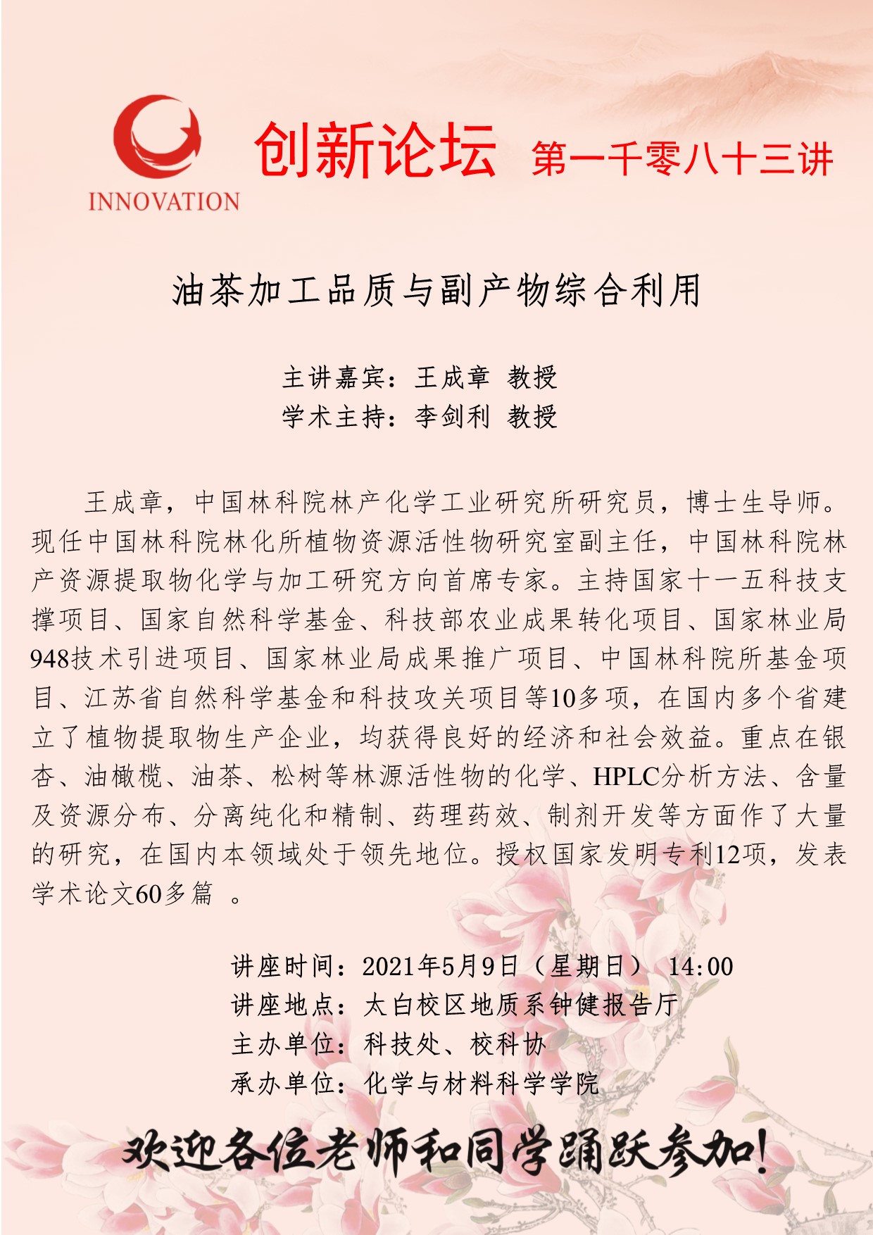 王成章 教授 伟德国际1949始于英国创新论坛第一千零八十三讲:油茶加工品质与副产物综合利用 讲座时间 2021年5月9日(星期日) 14:00 讲座地点 太白校区地质系钟健报告厅 讲座人介绍 王成章 教授 讲座内容