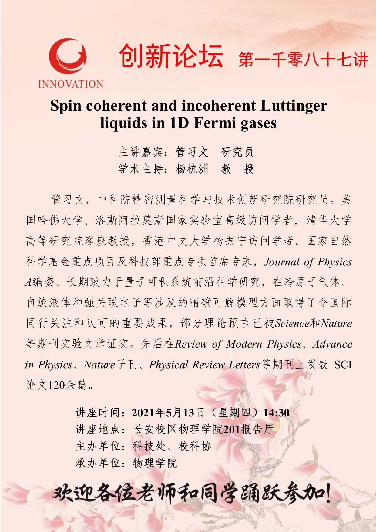 管习文 研究员 伟德国际1949始于英国创新论坛第一千零八十七讲:Spin coherent and incoherent Luttinger liquids in 1D Fermi gases 讲座时间 2021年5月13日(星期四)14:30 讲座地点 长安校区物理学院201报告厅 讲座人介绍 管习文 研究员 讲座内容
