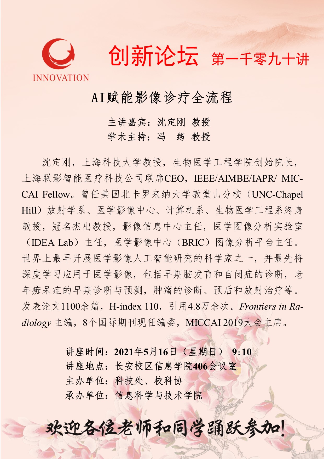 沈定刚 教授 伟德国际1949始于英国创新论坛第一千零九十讲:AI赋能影像诊疗全流程 讲座时间 2021年5月16日(星期日) 9:10 讲座地点 长安校区信息学院406会议室 讲座人介绍 沈定刚 教授 讲座内容