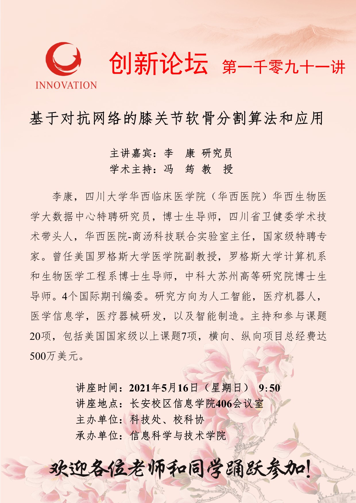 李 康 研究员 伟德国际1949始于英国创新论坛第一千零九十一讲:基于对抗网络的膝关节软骨分割算法和应用 讲座时间 2021年5月16日(星期日) 9:50 讲座地点 长安校区信息学院406会议室 讲座人介绍 李 康 研究员 讲座内容