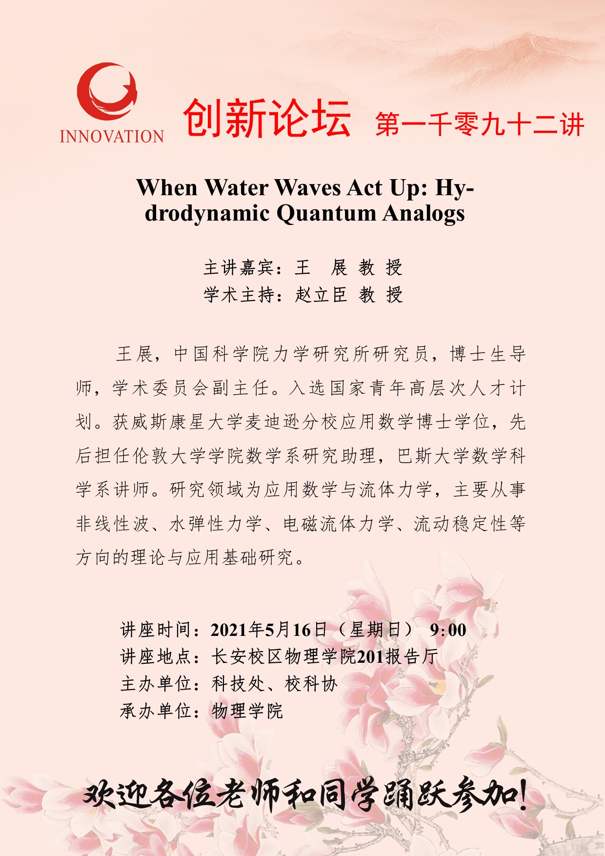 王 展 教 授 伟德国际1949始于英国创新论坛第一千零九十二讲:When Water Waves Act Up: Hydrodynamic Quantum Analogs 讲座时间 2021年5月16日(星期日) 9:00 讲座地点 长安校区物理学院201报告厅 讲座人介绍 王 展 教 授 讲座内容