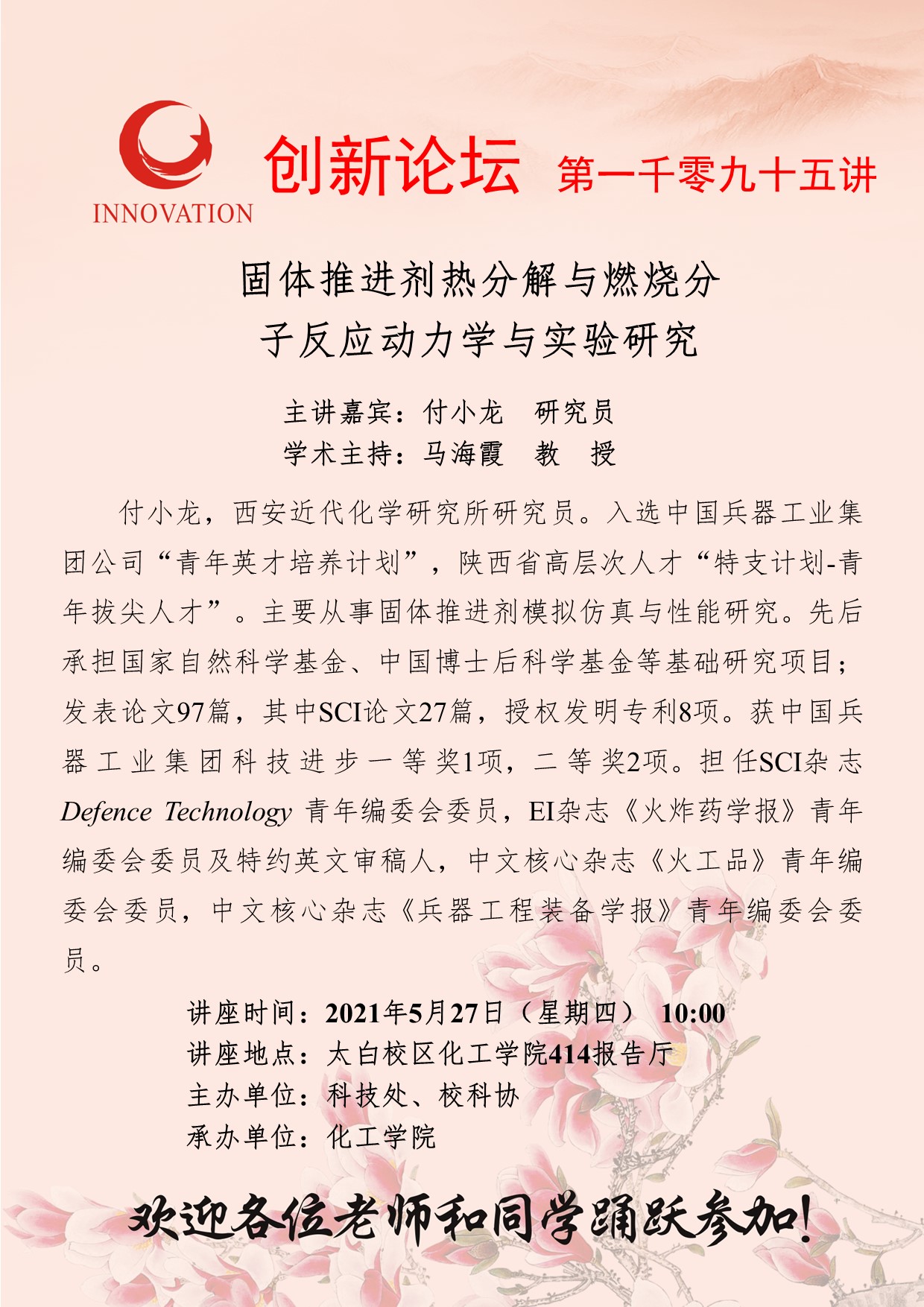 付小龙 研究员 伟德国际1949始于英国创新论坛第一千零九十五讲:固体推进剂热分解与燃烧分子反应动力学与实验研究 讲座时间 2021年5月27日(星期四) 10:00 讲座地点 太白校区化工学院414报告厅 讲座人介绍 付小龙 研究员 讲座内容