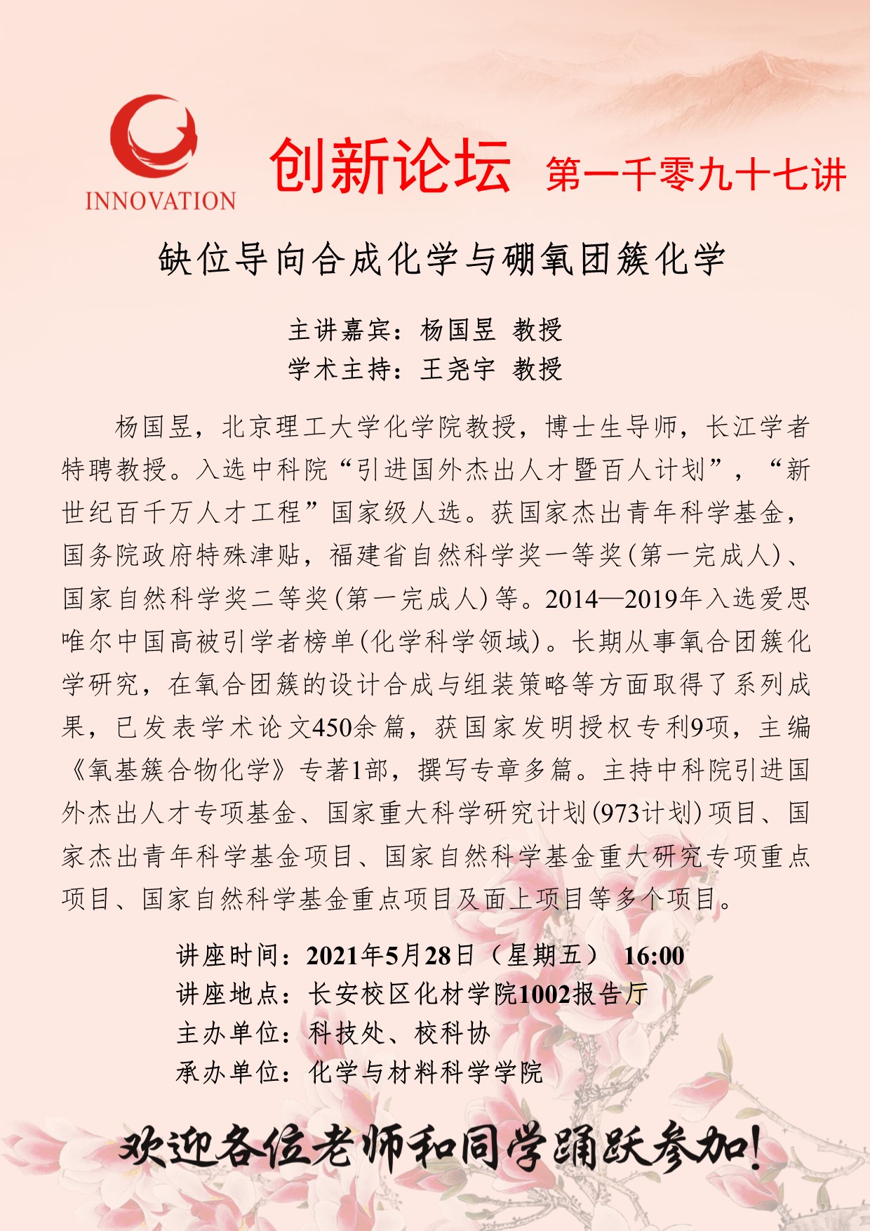 杨国昱 教授 伟德国际1949始于英国创新论坛第一千零九十七讲:缺位导向合成化学与硼氧团簇化学 讲座时间 2021年5月28日(星期五) 16:00 讲座地点 长安校区化材学院1002报告厅 讲座人介绍 杨国昱 教授 讲座内容