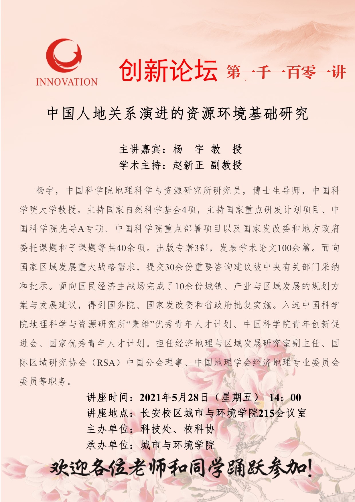 杨宇 教授 伟德国际1949始于英国创新论坛第一千一百零一讲:中国人地关系演进的资源环境基础研究 讲座时间 2021年5月28日(星期五)14:00 讲座地点 长安校区城市与环境学院215会议室 讲座人介绍 杨宇 教授 讲座内容