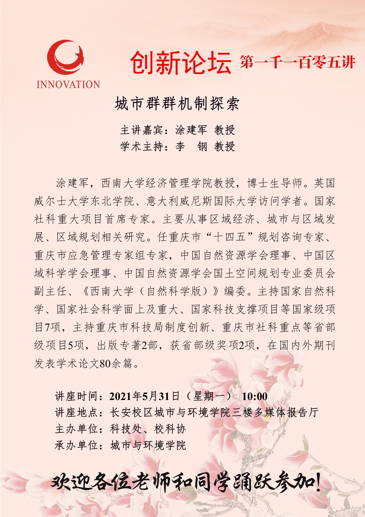 涂建军 教授 伟德国际1949始于英国创新论坛第一千一百零五讲:城市群群机制探索 讲座时间 2021年5月31日(星期一) 10:00 讲座地点 长安校区城市与环境学院三楼多媒体报告厅 讲座人介绍 涂建军 教授 讲座内容