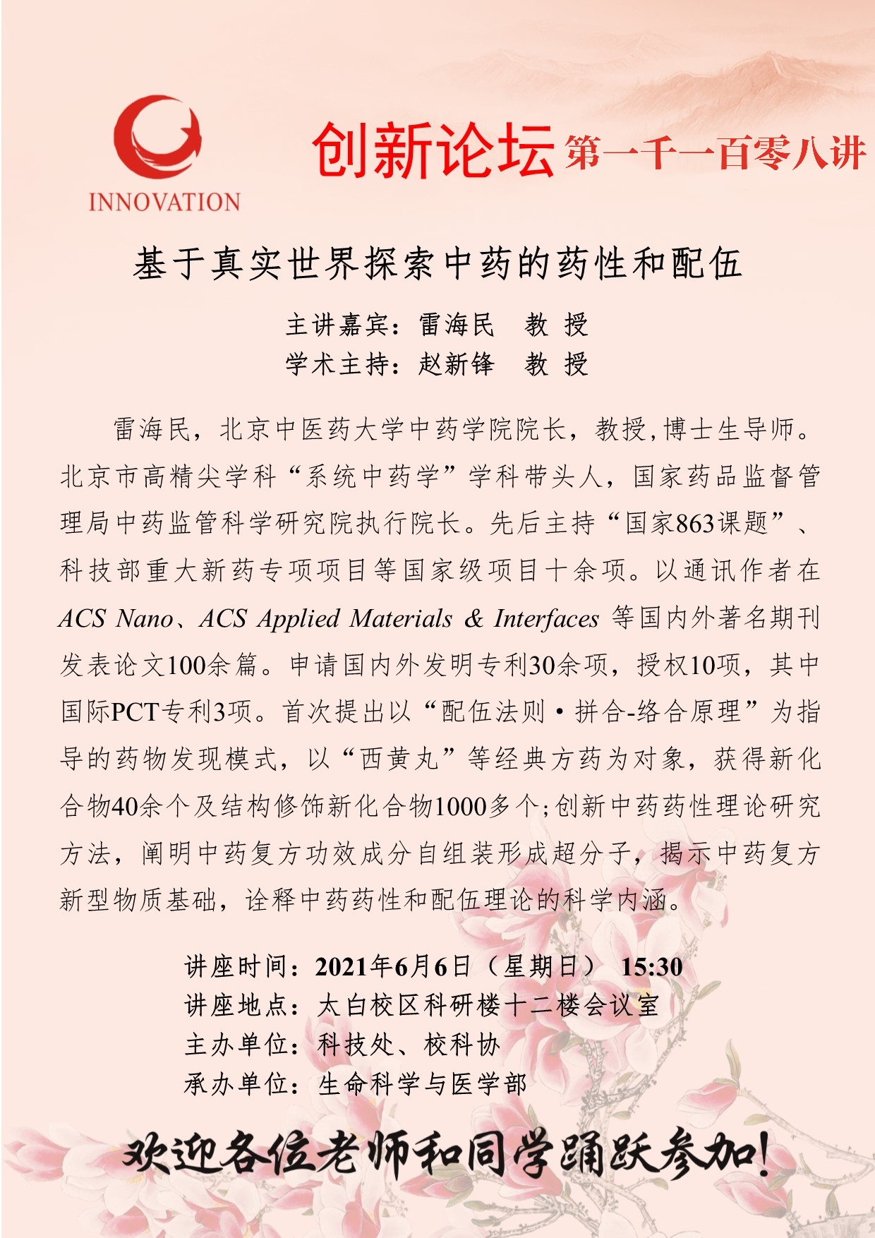 雷海民 教 授 伟德国际1949始于英国创新论坛第一千一百零八讲:基于真实世界探索中药的药性和配伍 讲座时间 2021年6月6日(星期日) 15:30 讲座地点 太白校区科研楼十二楼会议室 讲座人介绍 雷海民 教 授 讲座内容