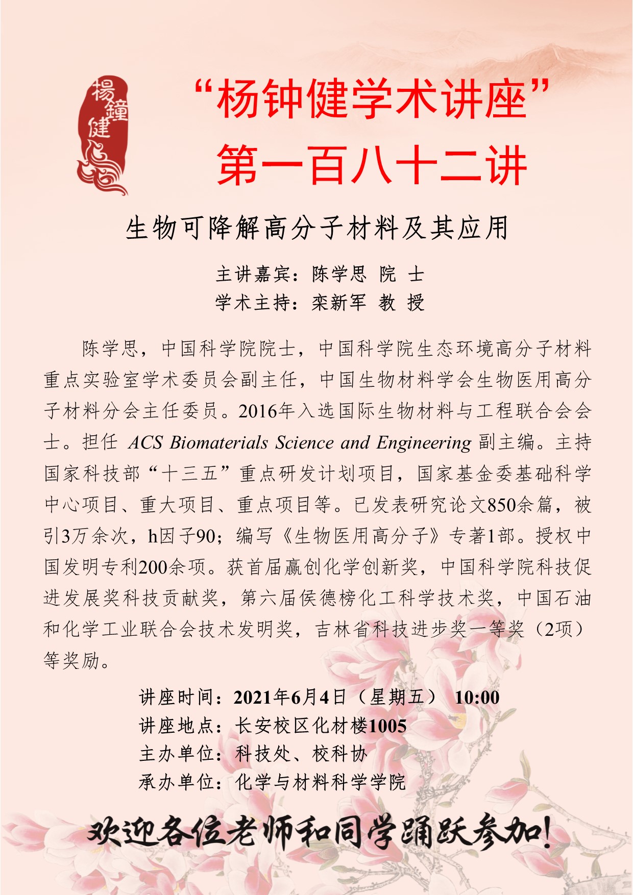 “杨钟健学术讲座”第一百八十二讲:生物可降解高分子材料及其应用