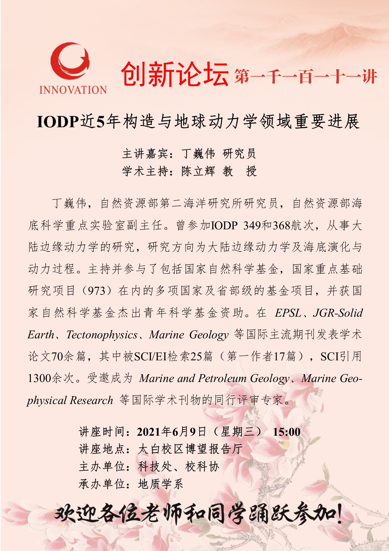 丁巍伟 研究员 伟德国际1949始于英国创新论坛第一千一百一十一讲:IODP近5年构造与地球动力学领域重要进展 讲座时间 2021年6月9日(星期三) 15:00 讲座地点 太白校区博望报告厅 讲座人介绍 丁巍伟 研究员 讲座内容