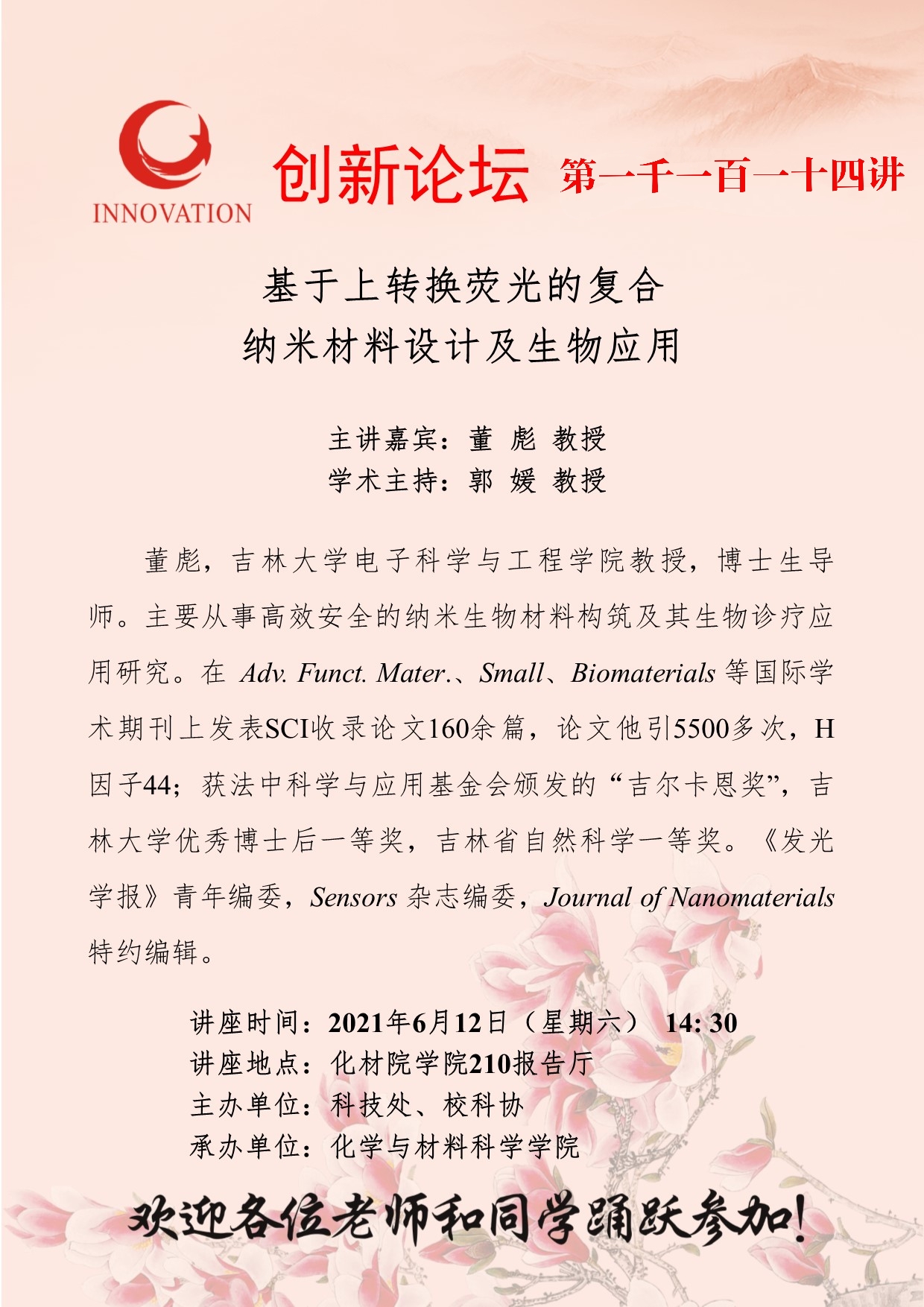 董彪 教授 伟德国际1949始于英国创新论坛第一千一百一十四讲:基于上转换荧光的复合纳米材料设计及生物应用 讲座时间 2021年6月12日(星期六) 14: 30 讲座地点 化材学院210报告厅 讲座人介绍 董彪 教授 讲座内容